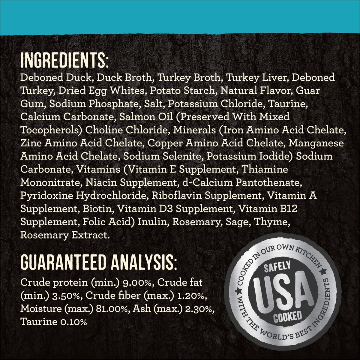Deboned Duck, Duck Broth, Turkey Broth, Turkey Liver, Deboned Turkey, Dried Egg Whites, Potato Starch, Natural Flavor, Guar Gum, Sodium Phosphate, Salt, Potassium Chloride, Taurine, Calcium Carbonate, Salmon Oil (Preserved With Mixed Tocopherols) Choline Chloride, Minerals (Iron Amino Acid Chelate, Zinc Amino Acid Chelate, Copper Amino Acid Chelate, Manganese Amino Acid Chelate, Sodium Selenite, Potassium Iodide) Sodium Carbonate, Vitamins (Vitamin E Supplement, Thiamine Mononitrate, Niacin Supplement, d-Calcium Pantothenate, Pyridoxine Hydrochloride, Riboflavin Supplement, Vitamin A Supplement, Biotin, Vitamin D3 Supplement, Vitamin B12 Supplement, Folic Acid) Inulin, Rosemary, Sage, Thyme, Rosemary Extract.