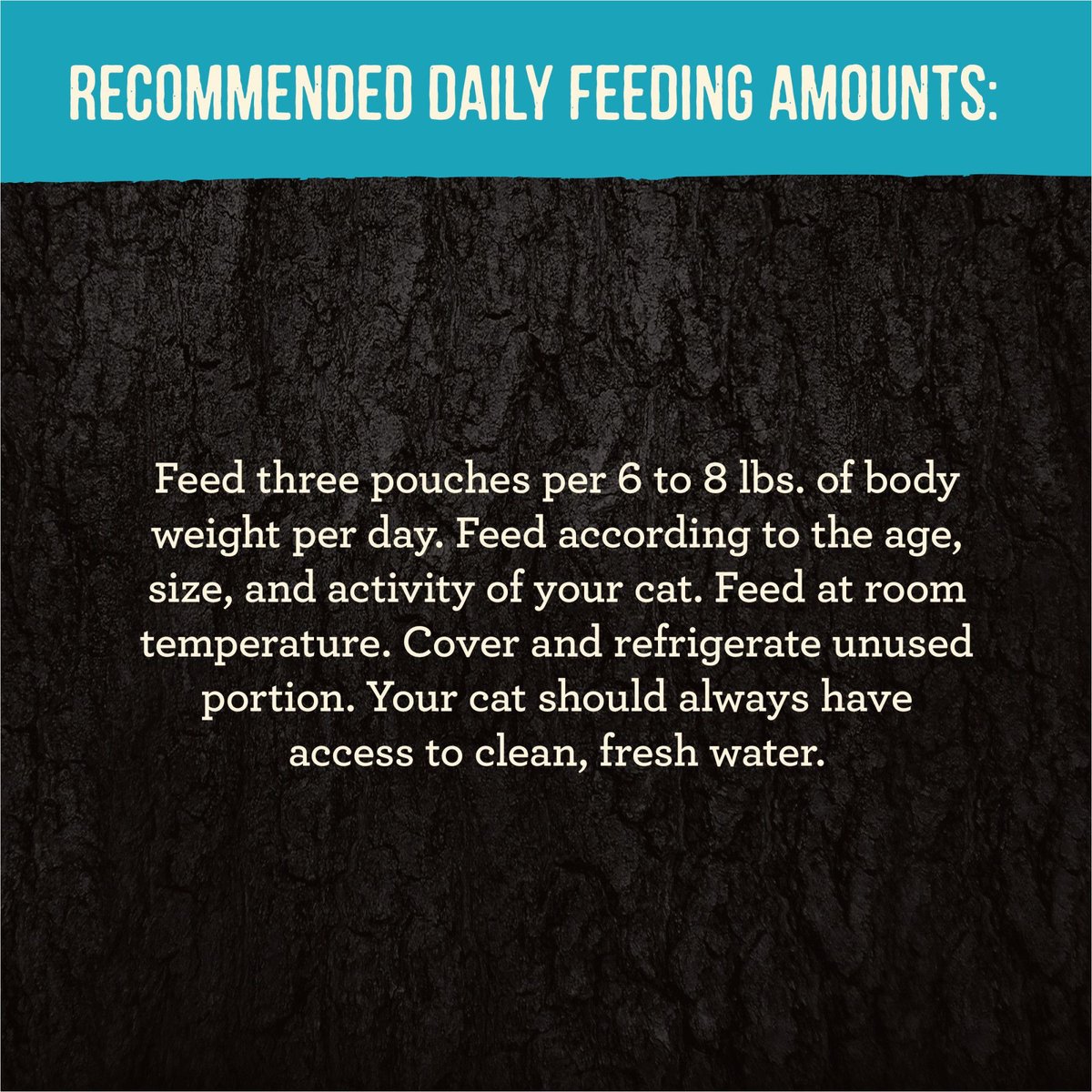 Feed three pouches per 6 to 8 lbs. of body weight per day. Feed according to the age, size, and activity of your cat. Feed at room temperature. Cover and refrigerate unused portion. Your cat should always have access to clean, fresh water.