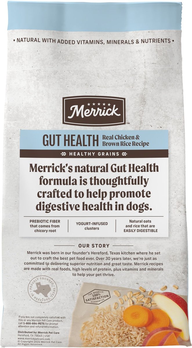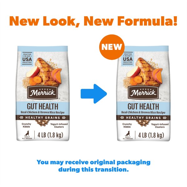 Transition Instructions: Gradually mix in the new food over 7 - 10 days, increasing the amount of Merrick Healthy Grains Gut Health Real Chicken + Brown Rice Recipe each day. This gradual transition will help avoid dietary upsets. For your pet's health, see your veterinarian regularly.