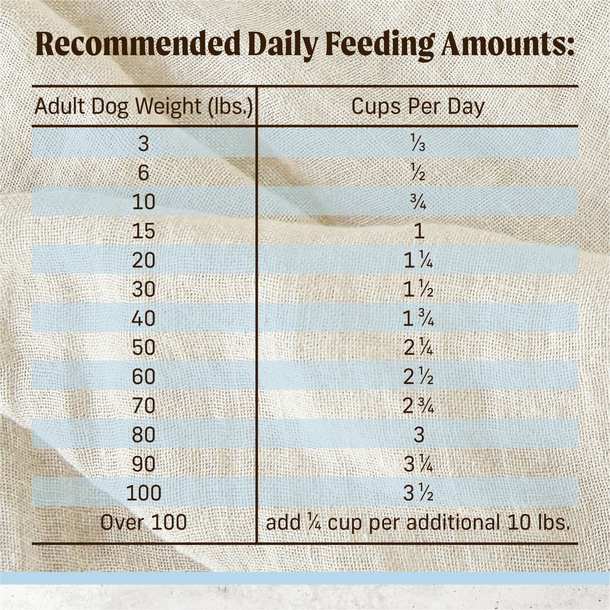 Every dog is a little different, so optimal feeding amounts may vary with age, size and activity level. Please use this information as an initial recommendation only and adjust when needed. Dry and wet food in combination will help to increase the level of water in your dog's diet. If feeding with wet food, reduce dry amount by 1/2 cup for every 6 oz of wet food.
