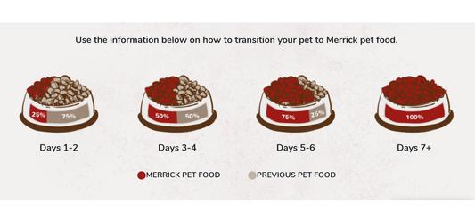 Over the course of 5-7 days, mix the Merrick food with your pet’s current food, continuously increasing the amount of the Merrick while decreasing the amount of the current diet.