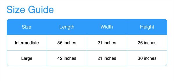 When folded down, the Medium/Large crates measures 36 inches long x 21 inches wide x 6 ½ inches high and the Large crate measures 42 inches long x 21 inches wide x 10 inches high.