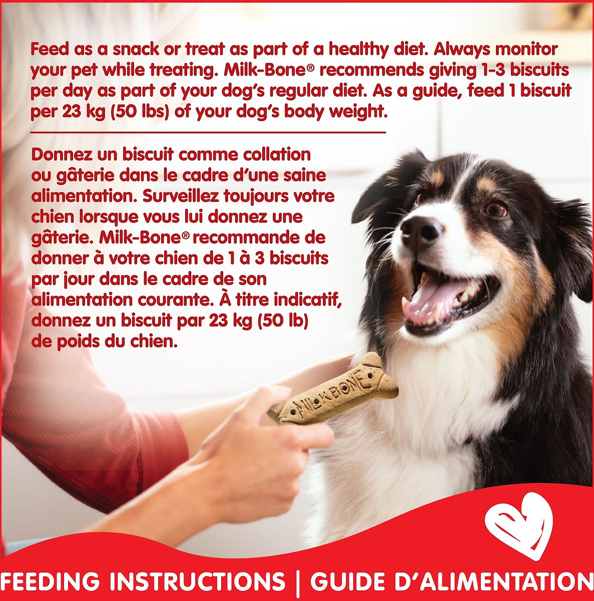 Feed as a snack or treat as part of a healthy diet. Always monitor your pet while treating. Milk-Bone recommends giving 1-3 biscuits per day as part of your dog's regular diet. As a guide, feed 1 biscuit per 23 kg (50 lbs) of your dog's body weight.