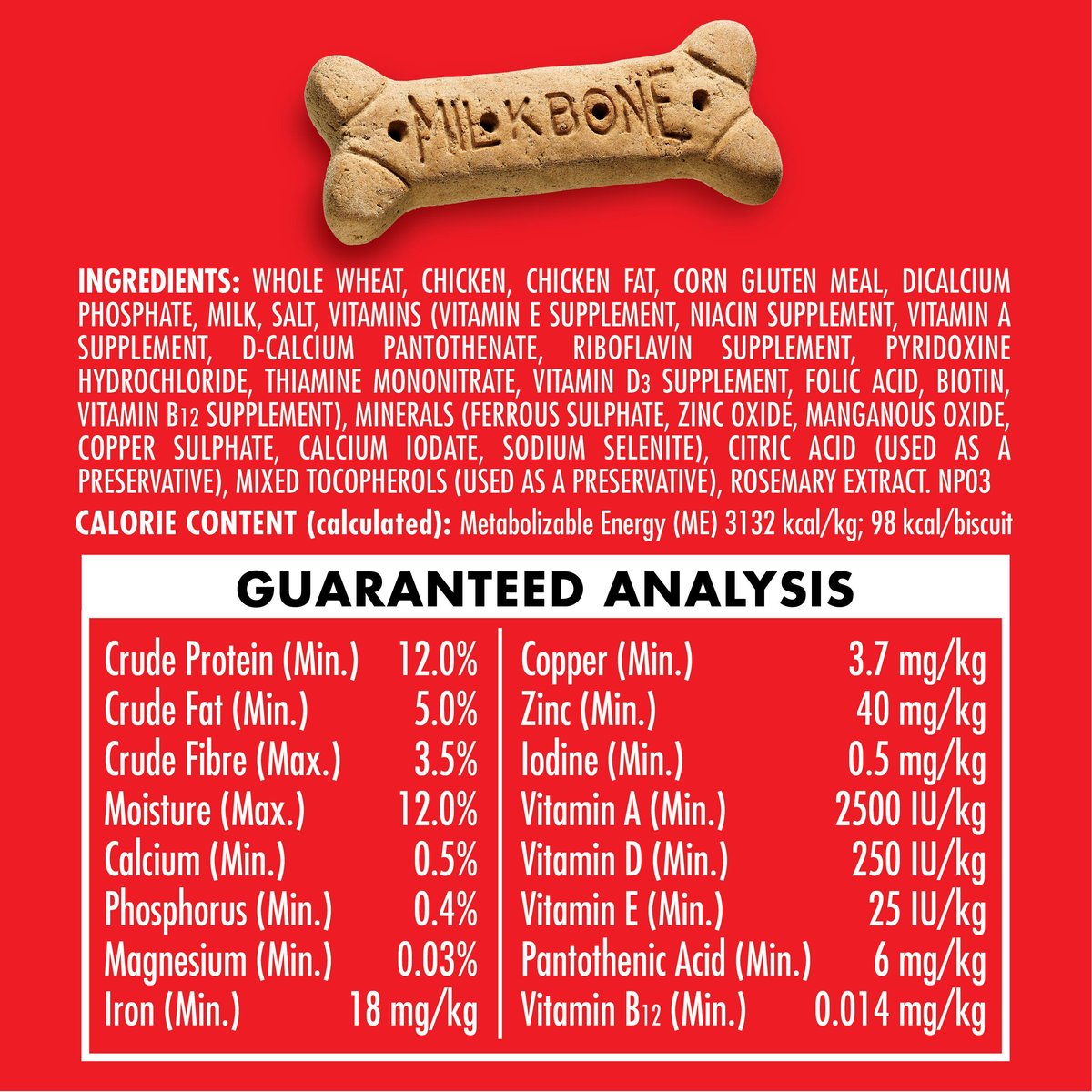 3132 kcal/kg; 98 kcal/biscuit