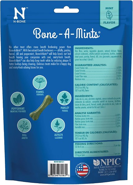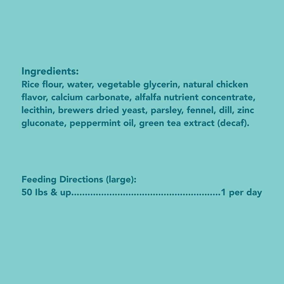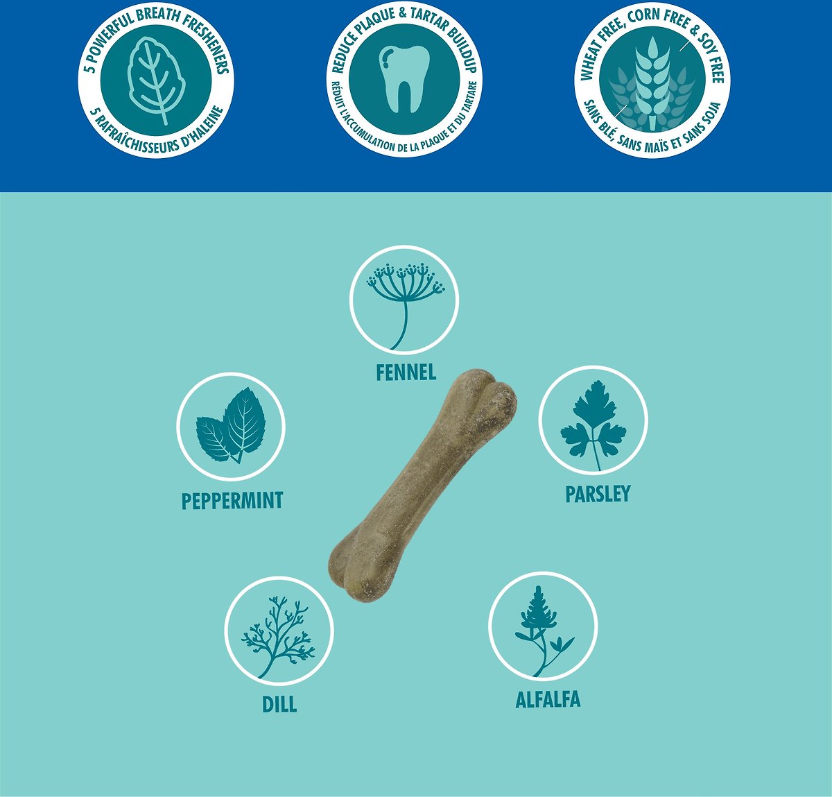 • Each bone features 5 natural breath fresheners including peppermint, parsley, fennel, dill, and alfalfa.