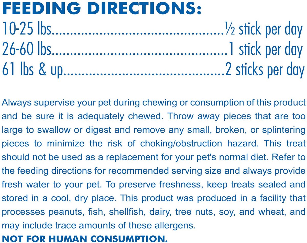 Always supervise your pet during chewing or consumption of this product and be sure it is adequately chewed. Throw away pieces that are too large to swallow or digest and remove any small, broken, or splintering pieces to minimize the risk of choking/obstruction hazard. This treat should not be used as a replacement for your pet's normal diet. Refer to the feeding directions for recommended serving size and always provide fresh water to your pet. To preserve freshness, keep treats sealed and stored in a cool, dry place. This product was produced in a facility that processes peanuts, fish, shellfish, dairy, tree nuts, soy, and wheat, and may include trace amounts of these allergens. NOT FOR HUMAN CONSUMPTION.