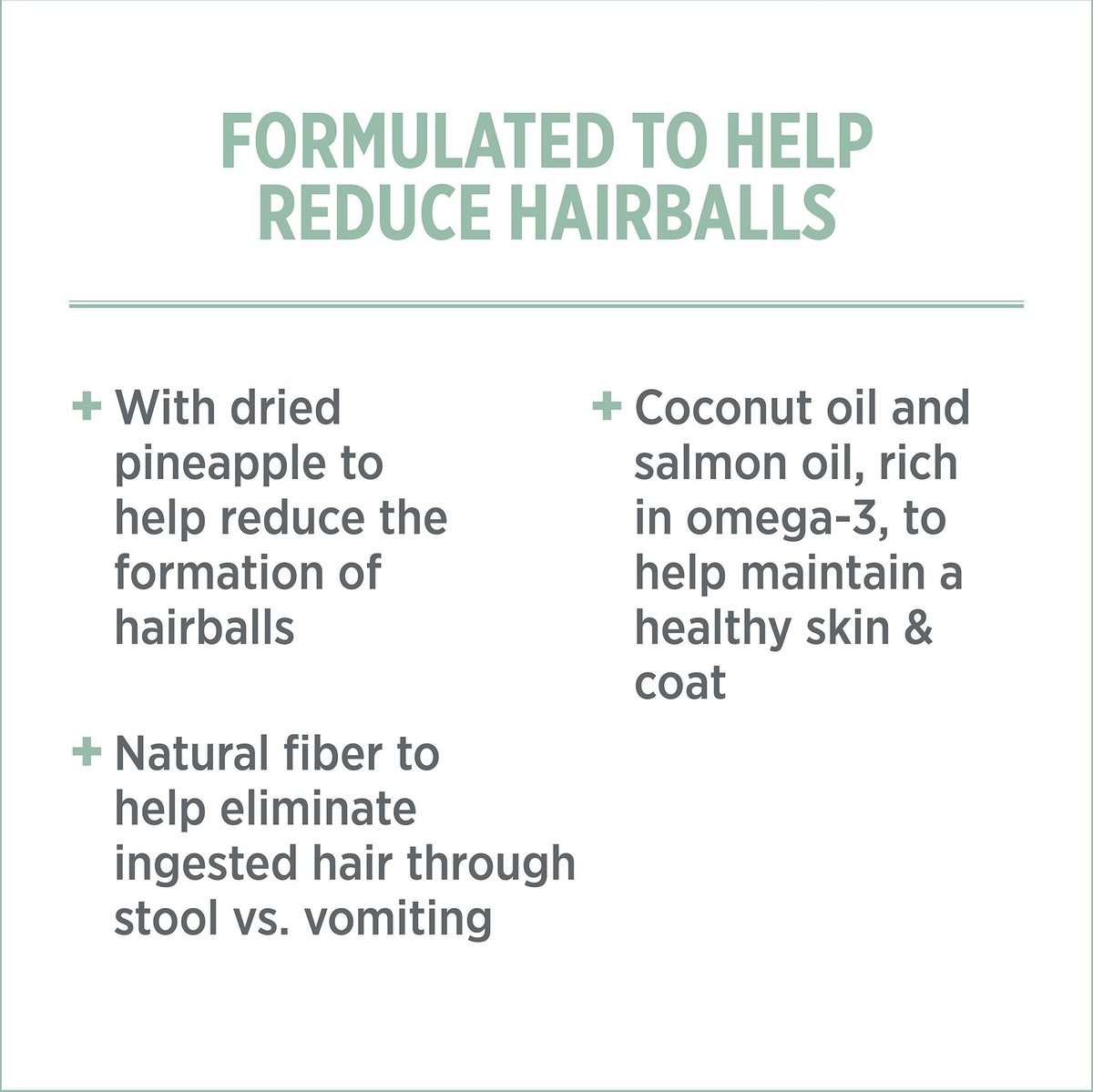 - Helps to eliminate ingested hair through your kitty’s poops, rather than forming hairballs.