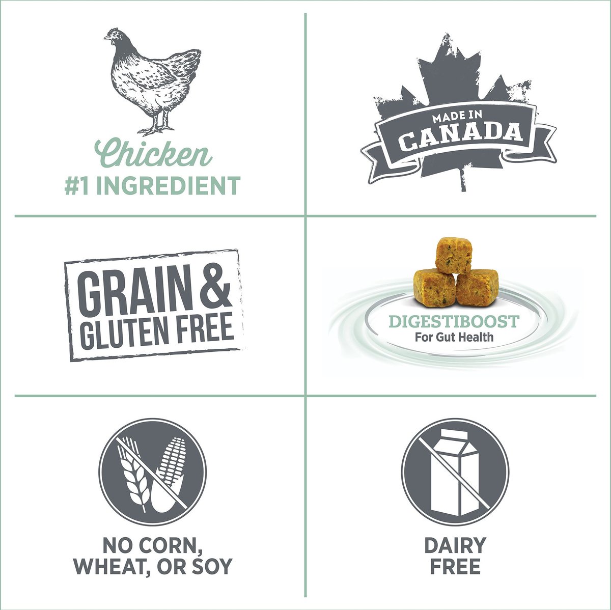 Chicken, Chicken Meal, Potato Protein, Peas, Chicken Fat (Preserved With Mixed Tocopherols), Sun-Cured Alfalfa Meal, Tapioca, Sun-Cured Ground Miscanthus Grass, Pea Fiber, Menhaden Oil, Natural Chicken Flavour, Tricalcium Phosphate, Flaxseed, Coconut Oil, Chickpeas, Lentils, Potassium Chloride, Botanicals (Ginger Root, Pumpkin, Turmeric, Carrot, Apple, Blueberry, Broccoli, Cranberry, Licorice Root, Peppermint Leaf, Pomegranate, Butternut Squash, Spinach), Salt, Salmon Oil, Sunflower Lecithin, Choline Chloride, Sodium Bisulfate, Minerals (Zinc Sulfate, Ferrous Sulfate, Zinc Proteinate, Manganese Sulfate, Iron Proteinate, Copper Sulfate, Manganese Proteinate, Sodium Selenite, Copper Proteinate, Calcium Iodate), Taurine, Dl-Methionine, Yeast Extract, L-Lysine, Vitamins [Vitamin E Supplement, L-Ascorbyl-2-Polyphosphate (Source Of Vitamin C), Niacin, Calcium Pantothenate, Riboflavin, Vitamin B12 Supplement, Menadione Sodium Bisulfite Complex (Source Of Vitamin K Activity), Vitamin A Supplement, Pyridoxine Hydrochloride, Thiamine Mononitrate, Biotin, Vitamin D3 Supplement, Folic Acid], Dried Chicory Root, L-Tyrosine, L-Carnitine, Organic Acids (Fumaric Acid, Lactic Acid, Citric Acid), Chia Seeds, Fructooligosaccharides, Yucca Schidigera Extract, Pineapple Extract (Source Of Bromelain), Rosemary Extract, Dried Lactobacillus Acidophilus Fermentation Product, Dried Lactobacillus Casei Fermentation Product, Dried Bifidobacterium Bifidum Fermentation Product, Dried Enterococcus Faecium Fermentation Product.