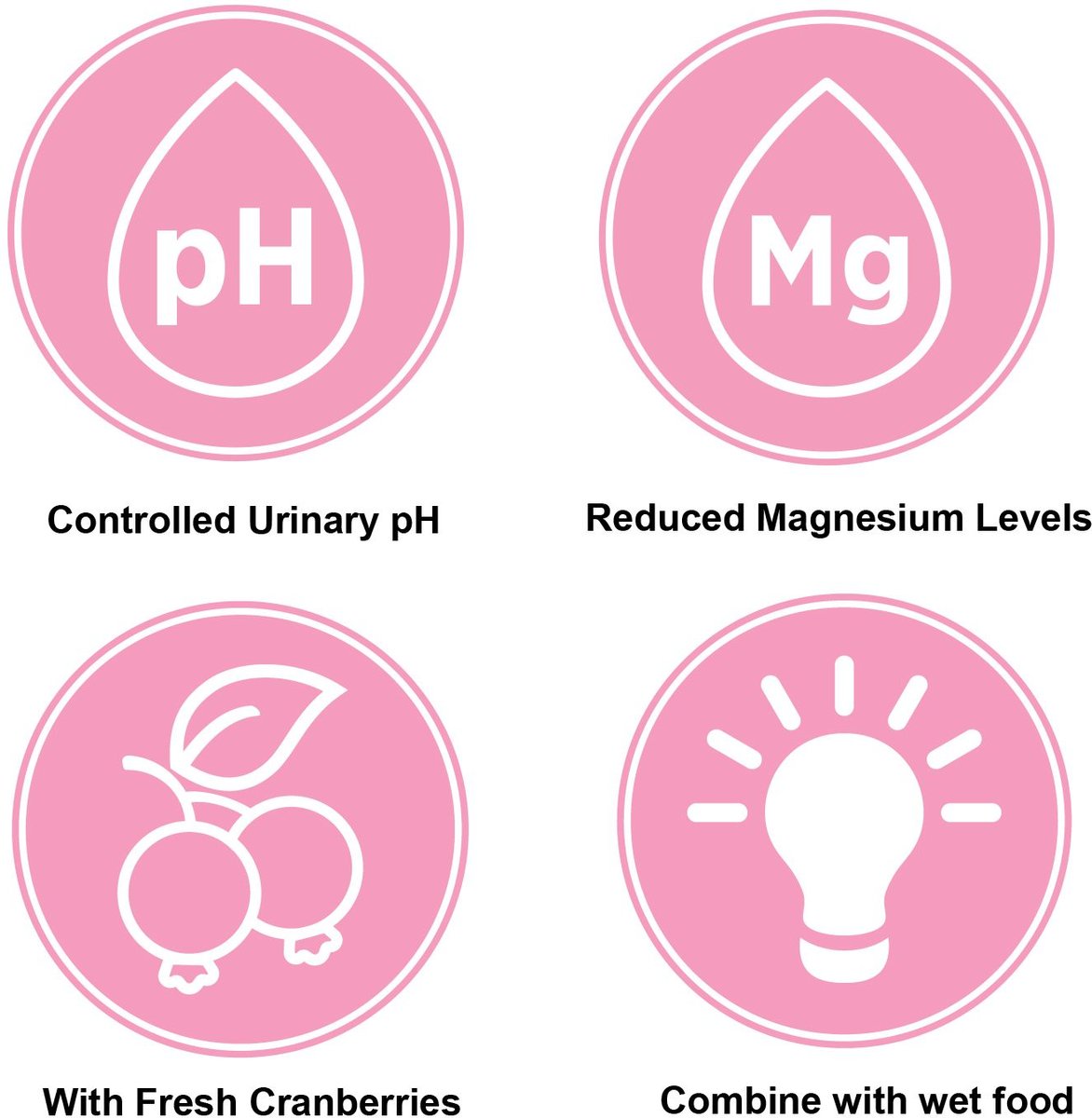• Reduced magnesium levels help to decrease the chance of struvite crystal formation.