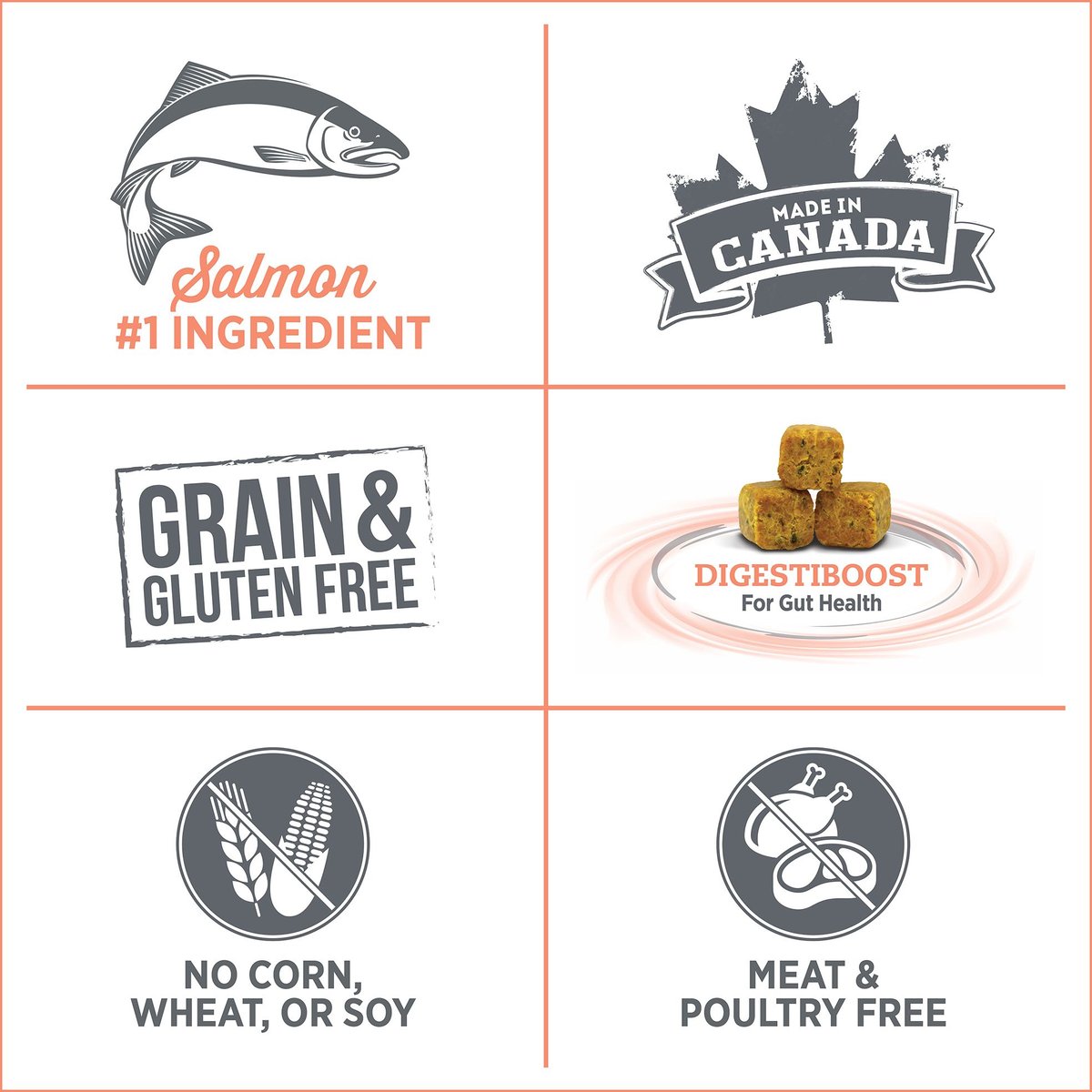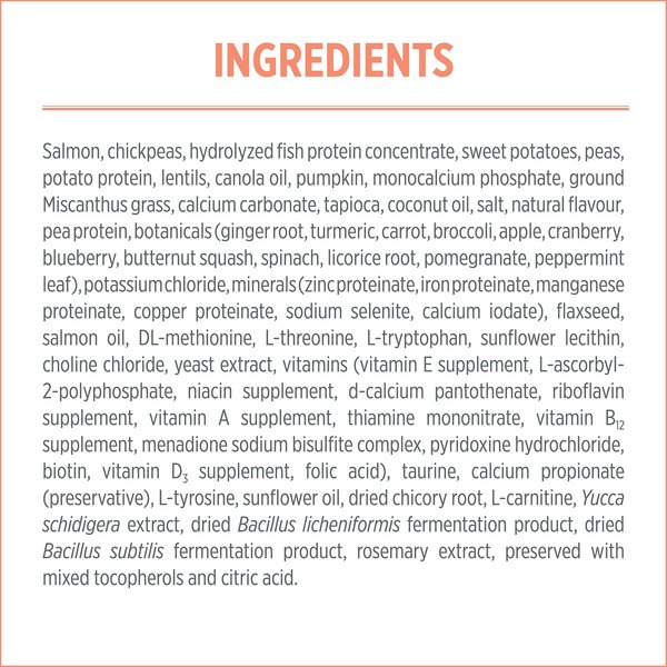 Salmon, Potato Protein, Hydrolyzed Fish Protein Concentrate, Sweet Potatoes, Lentils, Peas, Canola Oil (Preserved With Mixed Tocopherols), Pumpkin, Dicalcium Phosphate, Sun-Cured Ground Miscanthus Grass, Natural Fish Flavour, Flaxseed, Coconut Oil, Tapioca, Pea Protein, Potassium Chloride, Botanicals (Ginger Root, Turmeric, Carrot, Apple, Blueberry, Broccoli, Cranberry, Licorice Root, Peppermint Leaf, Pomegranate, Butternut Squash, Spinach), Salmon Oil, Salt, Choline Chloride, Minerals (Zinc Sulfate, Ferrous Sulfate, Zinc Proteinate, Manganese Sulfate, Iron Proteinate, Copper Sulfate, Manganese Proteinate, Selenium Yeast, Copper Proteinate, Calcium Iodate), Calcium Carbonate, Sunflower Lecithin, Yeast Extract, L-Tryptophan, Taurine, Calcium Propionate, Vitamins [Vitamin E Supplement, L-Ascorbyl-2-Polyphosphate (Source Of Vitamin C), Niacin, Calcium Pantothenate, Riboflavin, Vitamin B12 Supplement, Menadione Sodium Bisulfite Complex (Source Of Vitamin K Activity), Vitamin A Supplement, Pyridoxine Hydrochloride, Thiamine Mononitrate, Biotin, Vitamin D3 Supplement, Folic Acid], Dried Chicory Root, Dl-Methionine, L-Tyrosine, Glucosamine Hydrochloride, L-Carnitine, Organic Acids (Fumaric Acid, Lactic Acid, Citric Acid, Malic Acid), Chia Seeds, Chondroitin Sulfate, Fructooligosaccharides, Yucca Schidigera Extract, Rosemary Extract, Dried Lactobacillus Acidophilus Fermentation Product, Dried Lactobacillus Casei Fermentation Product, Dried Bifidobacterium Bifidum Fermentation Product, Dried Enterococcus Faecium Fermentation Product.