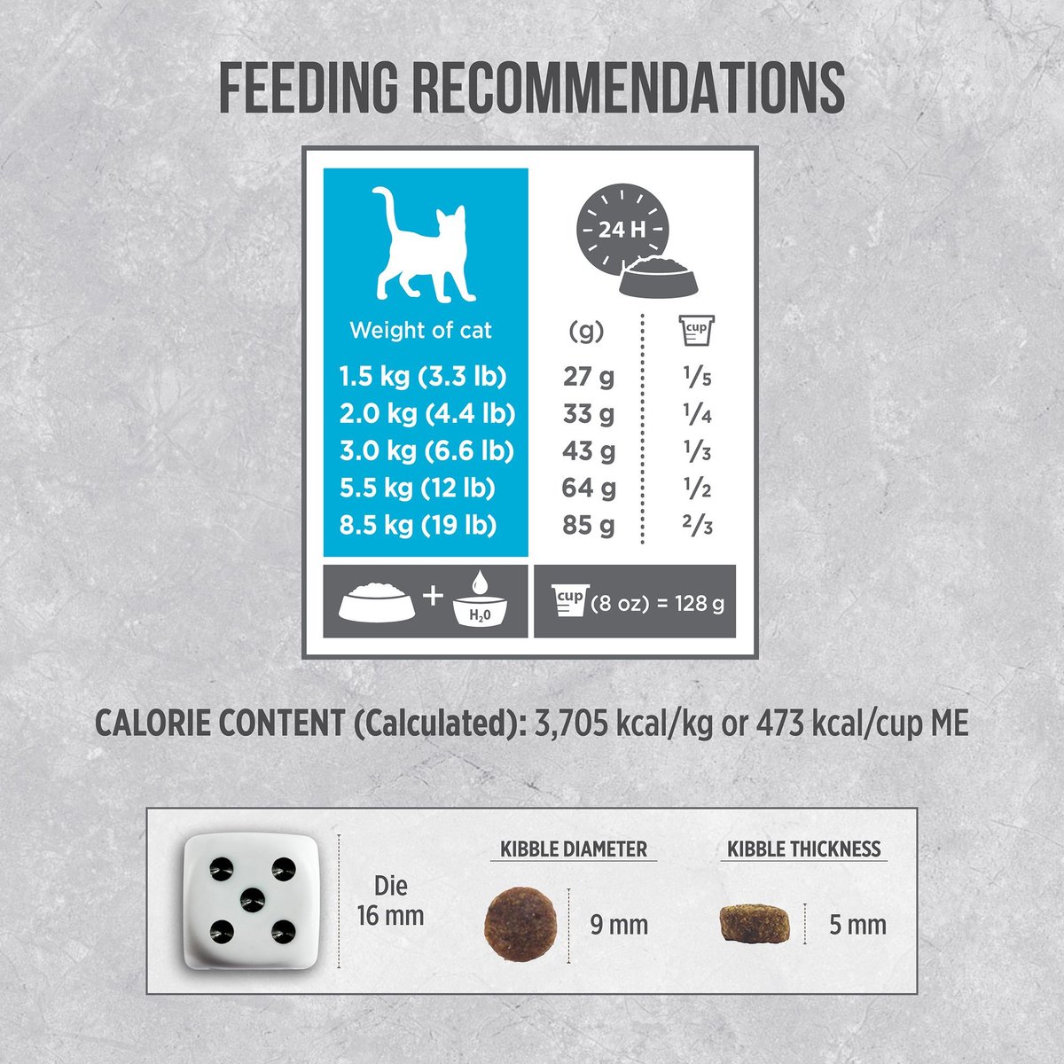 Calorie Content (calculated): 3,705 kcal/kg or 473 kcal/cup ME