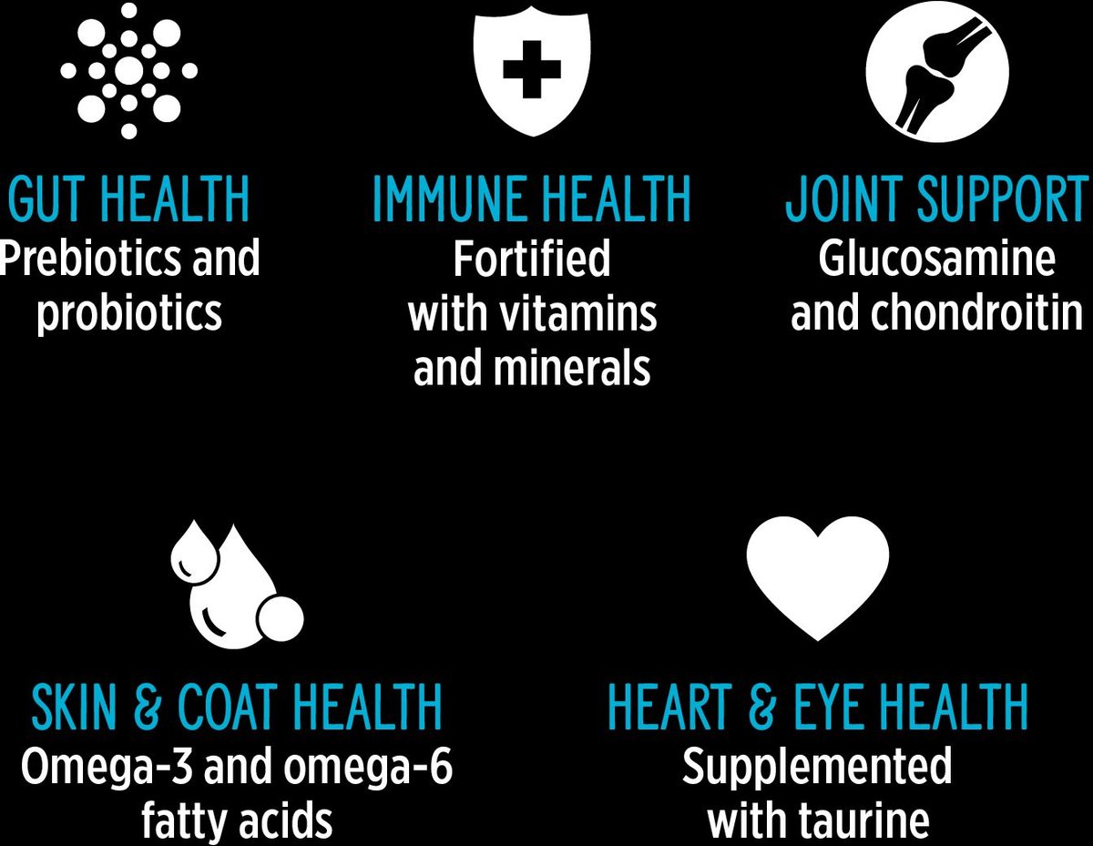 • Prebiotics and probiotics support gut health, and vitamins and minerals help your dog maintain a strong immune system.
