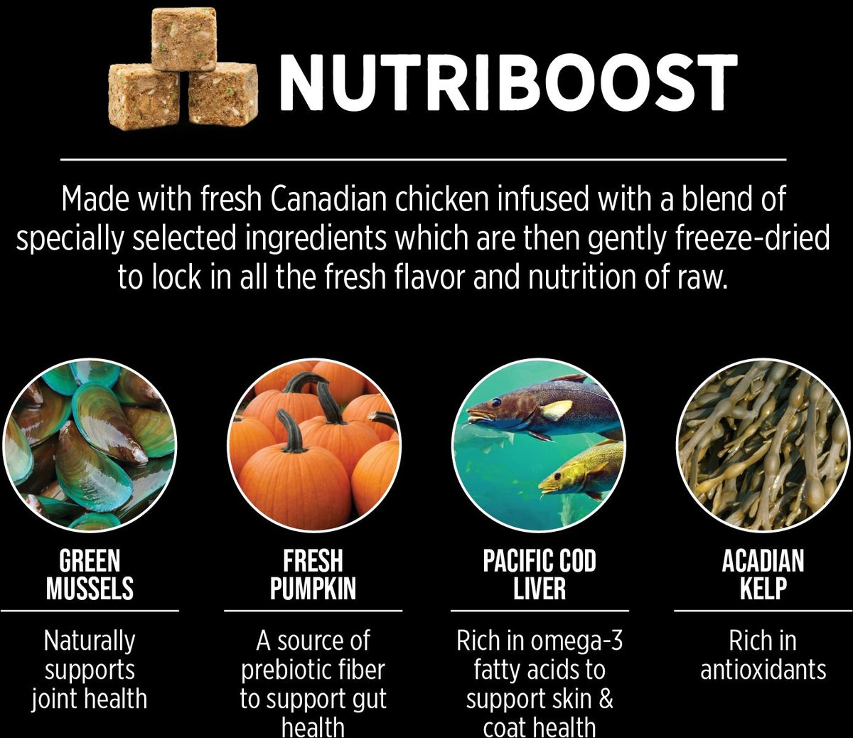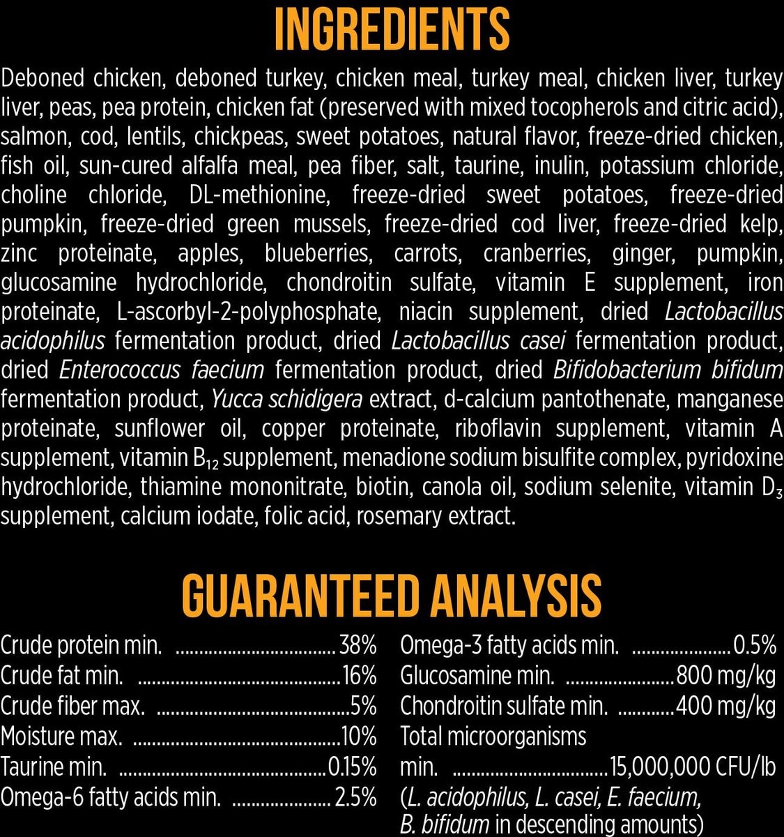 Freeze-Dried Sweet Potatoes, Freeze-Dried Pumpkin, Freeze-Dried Green Mussels, Freeze-Dried Cod Liver, Freeze-Dried Kelp, Zinc Proteinate, Apples, Blueberries, Carrots, Cranberries, Ginger, Pumpkin, Glucosamine Hydrochloride, Chondroitin Sulfate, Vitamin E Supplement, Iron Proteinate,