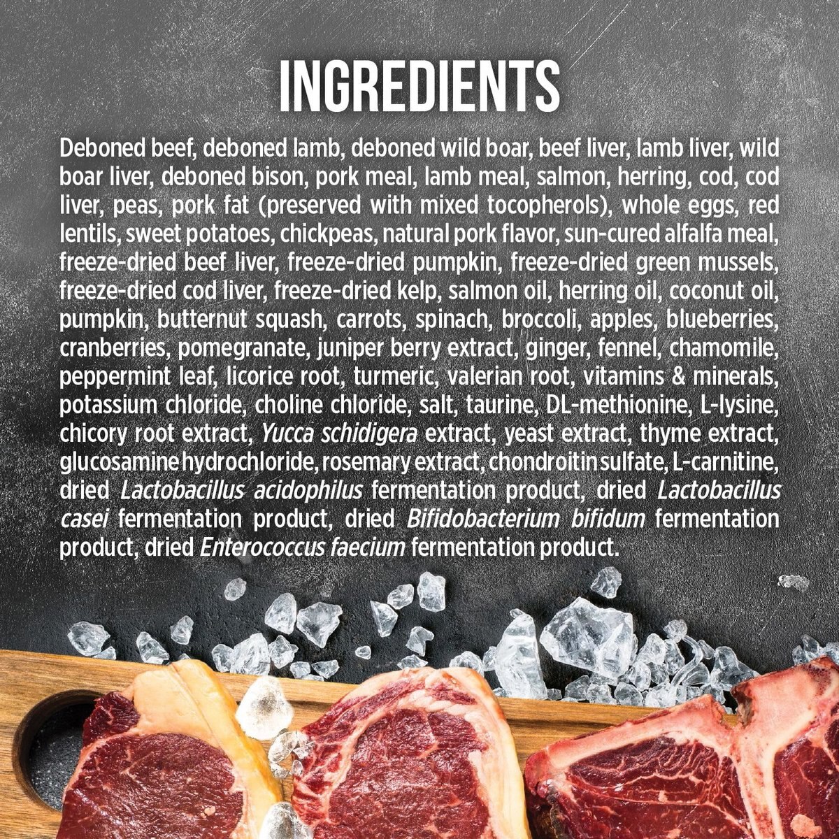 Deboned Beef, Deboned Lamb, Deboned Wild Boar, Deboned Pork, Deboned Bison, Beef Liver, Pork Liver, Pork Meal, Pea Protein, Peas, Pork Fat (Preserved With Mixed Tocopherols And Citric Acid), Natural Flavor, Freeze-Dried Beef Liver, Salmon, Cod, Sun-Cured Alfalfa Meal, Choline Chloride, Fish Oil, Dl-Methionine, Pea Fiber, Taurine, Salt, Inulin, Potassium Chloride, Freeze-Dried Sweet Potatoes, Freeze-Dried Pumpkin, Freeze-Dried Green Mussels, Freeze-Dried Cod Liver, Freeze-Dried Kelp, Zinc Proteinate, Apples, Blueberries, Carrots, Cranberries, Ginger, Pumpkin, Vitamin E Supplement, Iron Proteinate, L-Ascorbyl-2-Polyphosphate, Niacin Supplement, Dried Lactobacillus Acidophilus Fermentation Product, Dried Lactobacillus Casei Fermentation Product, Dried Enterococcus Faecium Fermentation Product, Dried Bifidobacterium Bifidum Fermentation Product, Yucca Schidigera Extract, D-Calcium Pantothenate, Manganese Proteinate, Sunflower Oil, Riboflavin Supplement, Vitamin A Supplement, Copper Proteinate, Thiamine Mononitrate, Vitamin BSupplement, Menadione Sodium Bisulfite Complex, Pyridoxine Hydrochloride, Biotin, Canola Oil, Sodium Selenite, Vitamin D Supplement, Folic Acid, Calcium Iodate, Rosemary Extract.