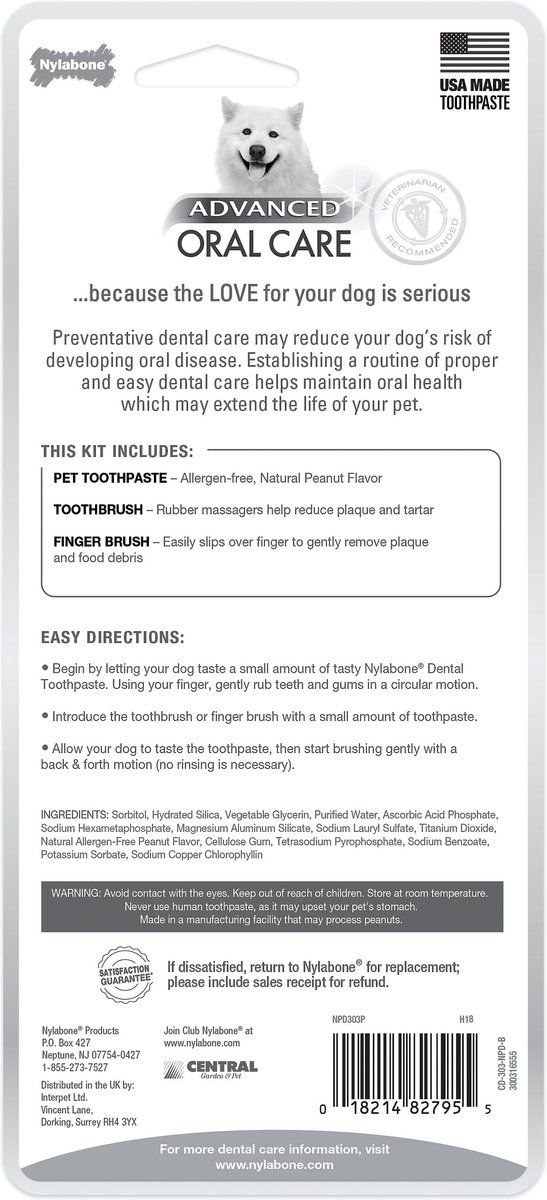 Your dog's teeth should be brushed as often as possible, ideally every day. Nylabone Advanced Oral Care line with Denta-CTM, is a scientifically-formulated blend of ingredients clinically proven to reduce plaque that harbors bacteria.