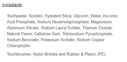 The Toothpaste contains: Sorbitol, Hydrated Silica, Glycerin, Water, Ascorbic Acid Phosphate, Sodium Hexametaphosphate, Magnesium Aluminum Silicate, Sodium Lauryl Sulfate, Titanium Dioxide, Natural Flavor, Cellulose Gum, Tetrasodium Pyrophosphate, Sodium Benzoate, Potassium Sorbate, Sodium Copper Chlorophyllin.