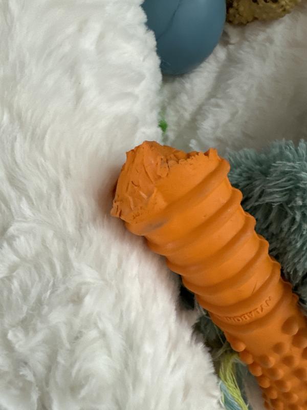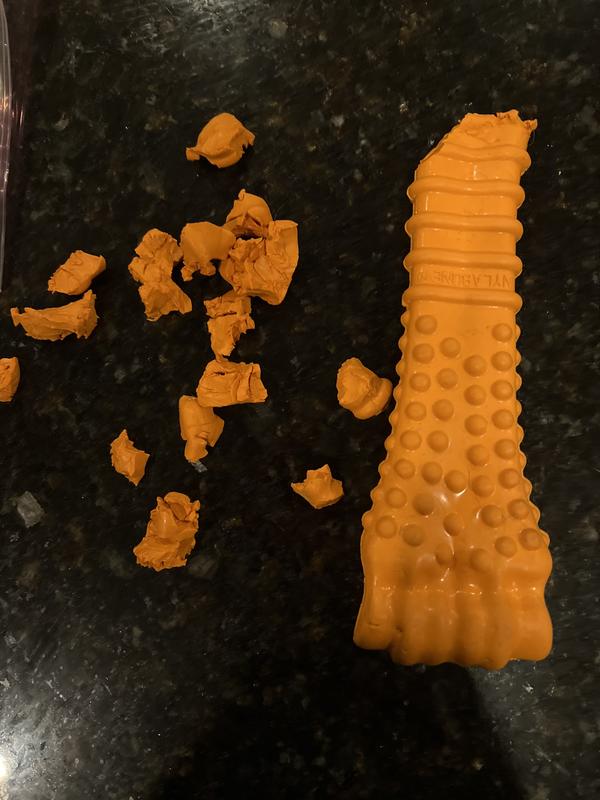 Bought because it’s advertised as being for strong chewers. Gave it to my 90lb pit mix and he had half of it ripped off in bits in half a day. He’s still playing