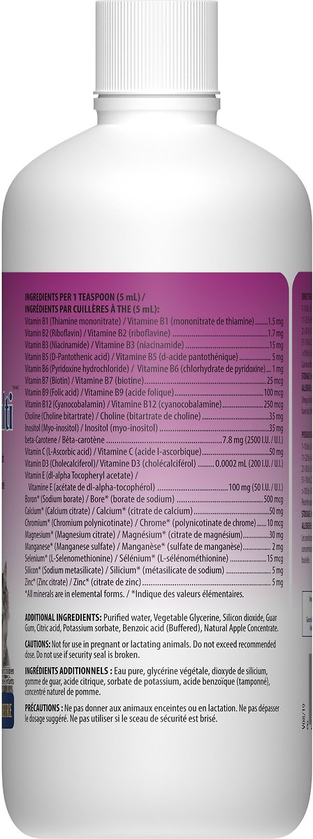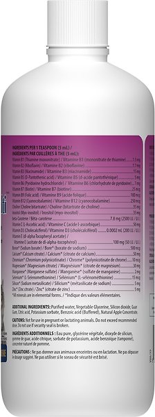 Ingredients Per 1 Teaspoon (5 ml): Vitamin B1 (Thiamine Mononitrate) 15 mg, Vitamin B2 (Riboflavin) 17 mg, Vitamin B3 (Niacinamide) 15 mg, Vitamin B5 (D-Pantothenic Acid) 5 mg, Vitamin B6 (Pyridoxine Hydrochloride) 1 mg, Vitamin B7 (Biotin) 25 mcg, Vitamin B9 (Folic Acid) 100 mcg, Vitamin B12 (Cyanocobalamin) 250 mcg, Choline (Choline Bitartrate) 35 mg, Inositol (Myo-Inositol) 35 mg, Beta-Carotene 78 mg (2500 IU), Vitamin C (L-Ascorbic Acid) 50 mg, Vitamin D3 (Cholecalciferol) 200 IU, Vitamin E (Dl-Alpha Tocopheryl Acetate) 100 mg (50 IU), Boron (Sodium Borate) 500 mcg, Calcium (Calcium Citrate) 50 mg, Chromium (Chromium Polynicotinate) 10 mcg, Magnesium (Magnesium Citrate) 30 mg, Manganese (Manganese Sulphate) 2 mg, Selenium (Selenomethionine) 15 mcg, Silicon* (Sodium Metasilicate) 5 mg,
