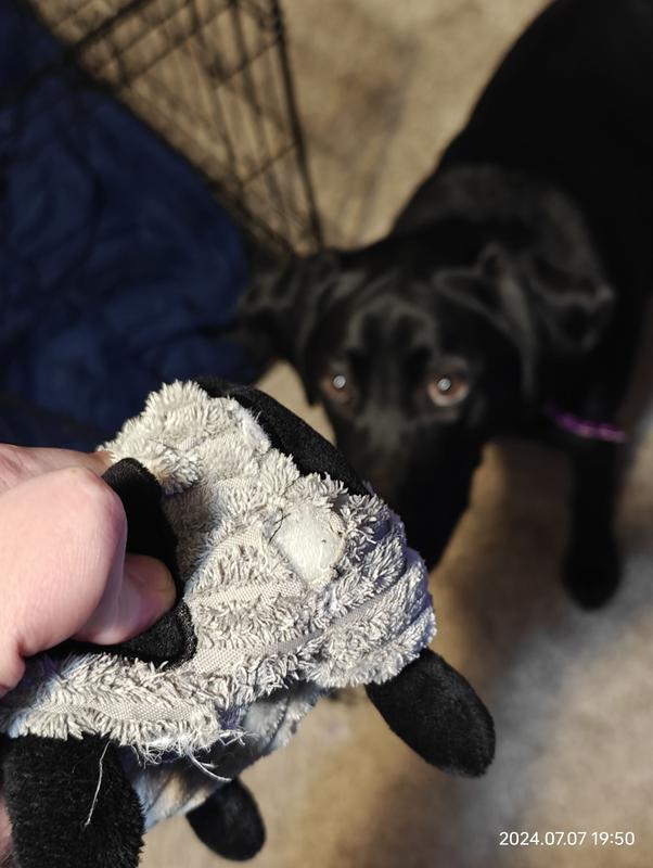 My dogs generally do very well with products from this particular company brand. So I took the chance and purchased this stuffed animal and as you can see by the photo it was gutted very quickly. I bought it for them for Christmas and it didn’t last the time it took me to walk out of the room. One labrador puppy had ripped off one of the feet and swallowed it while the other Labrador puppy was running around the house with the stuffed animals squeaking guts in her mouth. So while the puppies thought it was a great toy it obviously is not meant for any kind of play other than maybe snuggling with. Definitely would not recommend if your dog intends to play with it