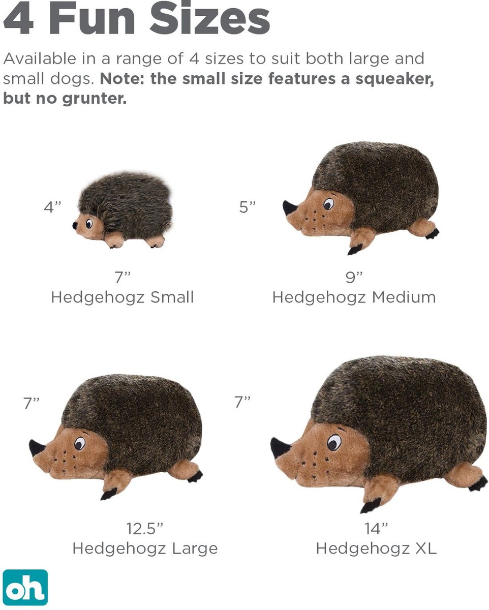 The Small and Medium hedgehogz include one squeaker while the Large and XL hedgehogz include one grunter squeaker and a rattler for extra excitement.