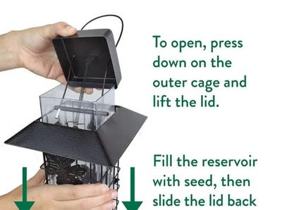 To fill the feeder, press down on the outer cage and lift up on the lid. Fill with seed, then slide the lid back over the seed tube.