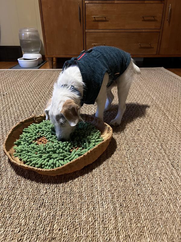 My lab mix has never been a really fast eater. She's 14yo now and starting to be less physically active, so I'm trying to find different ways to give her some mental exercise without adding extra food or treats. This mat is great! I give her half her food in her bowl and the other half on the snuffle mat and she'll go back and forth between the 2 for about 15-20 minutes. Then she'll drink some water and go back to sniff out any pieces that she missed. The extra mental work seems to be helping with her restlessness and sleepy better through the night.