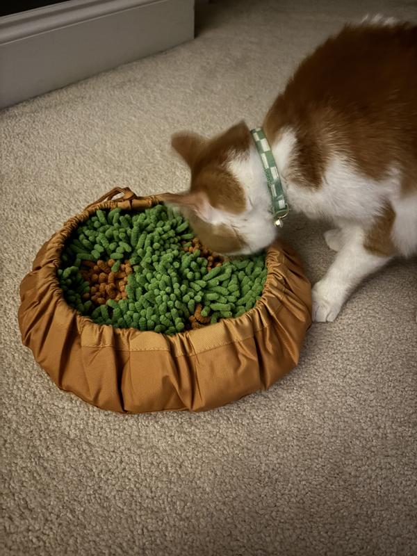 Our rescue kitty who we affectionately call “Sausage” is extremely food motivated and eats his dry food portions in about 30 seconds from a regular dish. This snuffle
