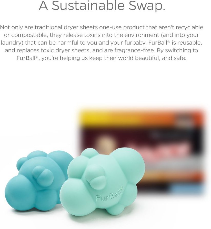 • A sustainable swap for toxic one-use dryer sheets, FurBall is chemical-free and helps reduce waste.