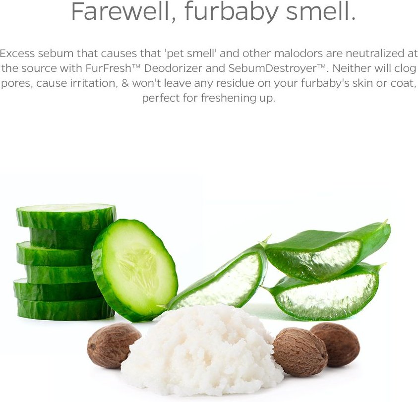 Purified Water, Vegetable Glycerin, Decyl Glucoside, Tetrasodium Glutamate Diacetate, Ethylhexylglycerin, Phenoxyethanol, Shea Butter, Cucumber Extract, Aloe Vera, Sunflower Seed Oil, FurFresh™ Deodorizer (Mineral-Based Deodorizer), SebumDestroyer™, Vitamin E (Non-Synthetic), Colloidal Oatmeal, Probiotics Blend, Enzyme Blend, Vanilla or Lavender Oil.