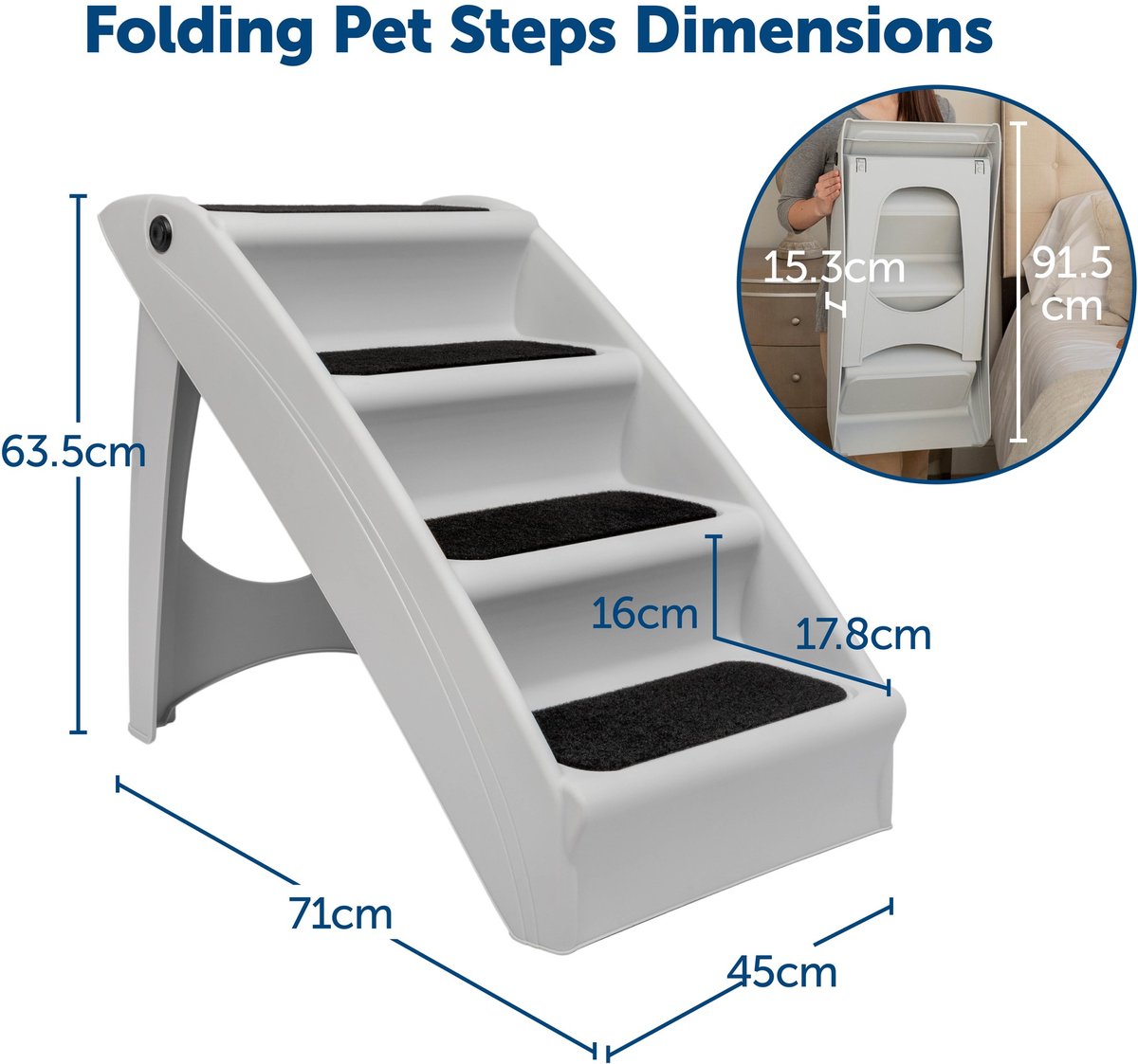 - Convenient folding steps help your dog or cat easily get on and off couches or beds.