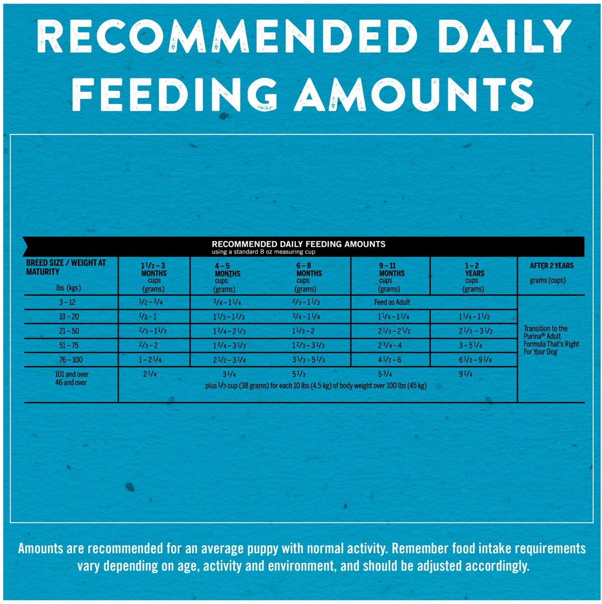 The feeding guidelines from the manufacturer say "feed as adult" for puppies weighting 3-12 pounds and in this case, it normally refers to doing ½ to 1 cup per feeding. This will vary depending on age, activity and environment, and should be adjusted accordingly. We always recommend to consult a veterinarian about this stage of feeding, as they are in the best position to provide your dog's nutritional needs.