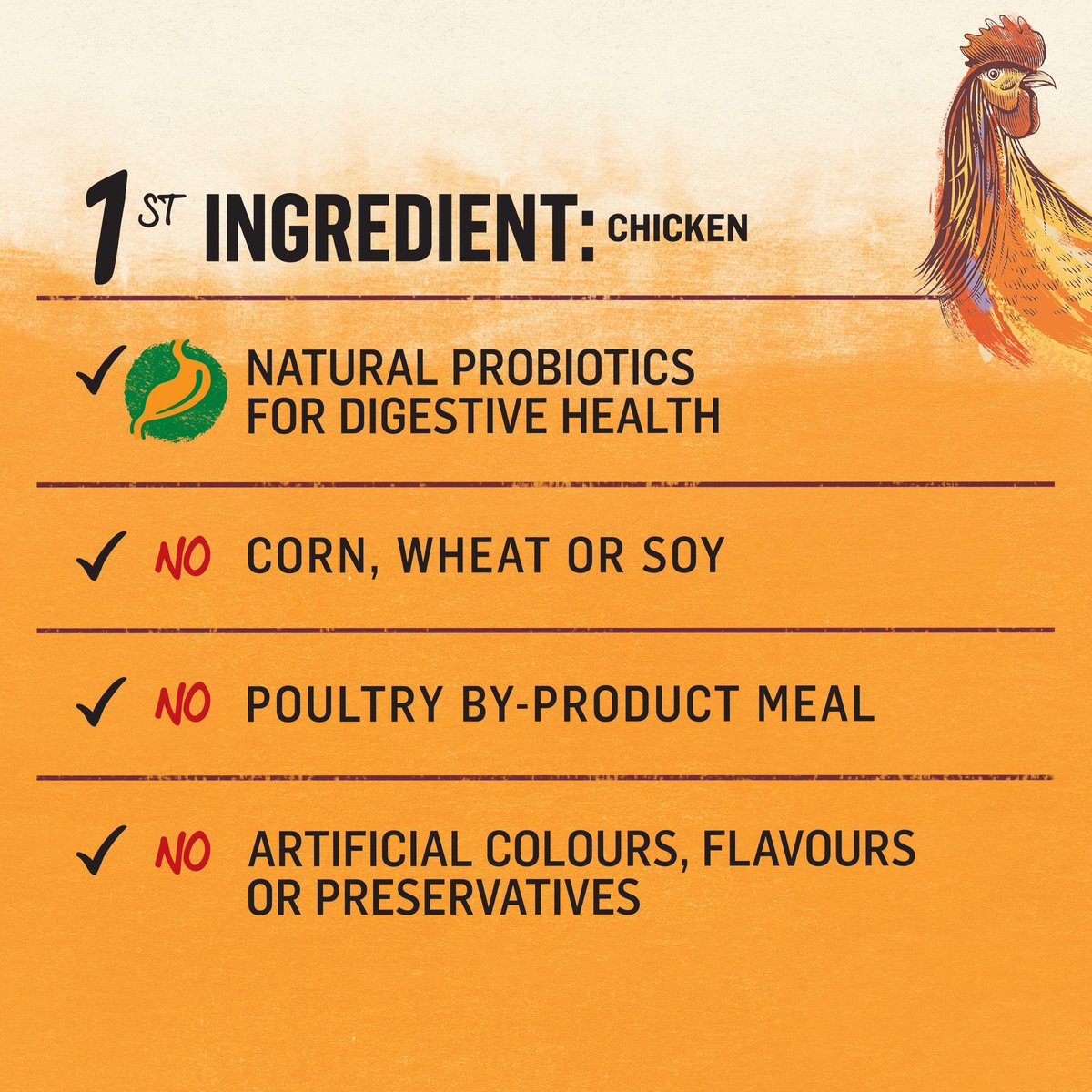 Chicken, Chicken Meal, Cassava Root Flour, Dried Egg Product, Pea Protein, Dried Yeast, Pea Starch, Beef Fat Preserved with Mixed-Tocopherols, Canola Meal, Pea Fibre, Natural Flavour, Dried Beet Pulp, Dried Carrots, Phosphoric Acid, Sodium Bisulphate, Salt, L-Lysine Monohydrochloride, Potassium Chloride, Calcium Carbonate, DL-Methionine, Choline Chloride, Taurine, Minerals [Zinc Sulphate, Ferrous Sulphate, Manganese Sulphate, Copper Sulphate, Calcium Iodate, Sodium Selenite], Vitamins [Vitamin E Supplement, Niacin (Vitamin B-3), Vitamin A Supplement, Calcium Pantothenate (Vitamin B-5), Thiamine Mononitrate (Vitamin B-1), Vitamin B-12 Supplement, Riboflavin Supplement (Vitamin B-2), Pyridoxine Hydrochloride (Vitamin B-6), Folic Acid (Vitamin B-9), Menadione Sodium Bisulphite Complex (Vitamin K), Vitamin D-3 Supplement, Biotin (Vitamin B-7)], Vitamin E Supplement, Dried Bacillus Coagulans Fermentation Product. D425923.