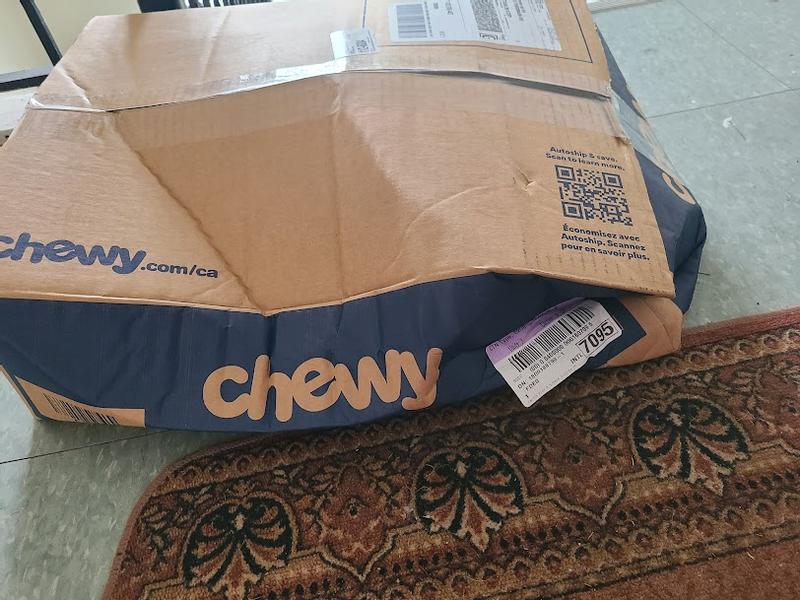 The box looked like someone had stepped on it. The food (cat kibble) was thankfully not crushed as it was packed very well with lots of paper packing. Good service from the company. The delivery company....not so great.