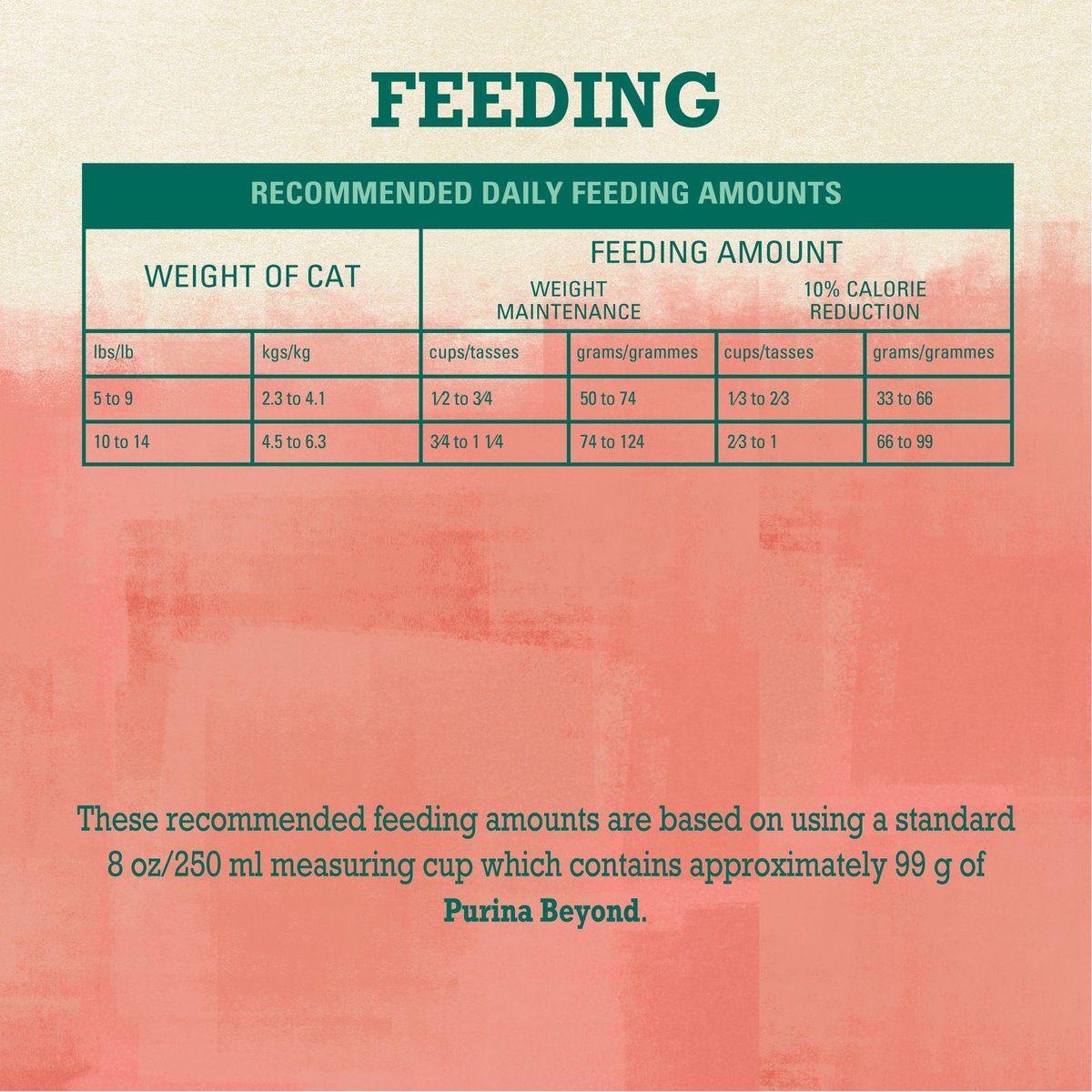 Adult Cat: These recommended feeding amounts are based on using a standard 8 oz./250mL measuring cup which contains approximately 99g of Purina Beyond. Use the recommended amount to fill your cat's bowl in the morning, so your cat can enjoy Purina Beyond throughout the day. Ideal body condition should be maintained by adjusting this amount based on your cat's age, activity and environment. Nutritional needs will change over time. You can best serve your pet by feeding the amount that maintains a healthy weight, whereby you can easily feel your cat's ribs.