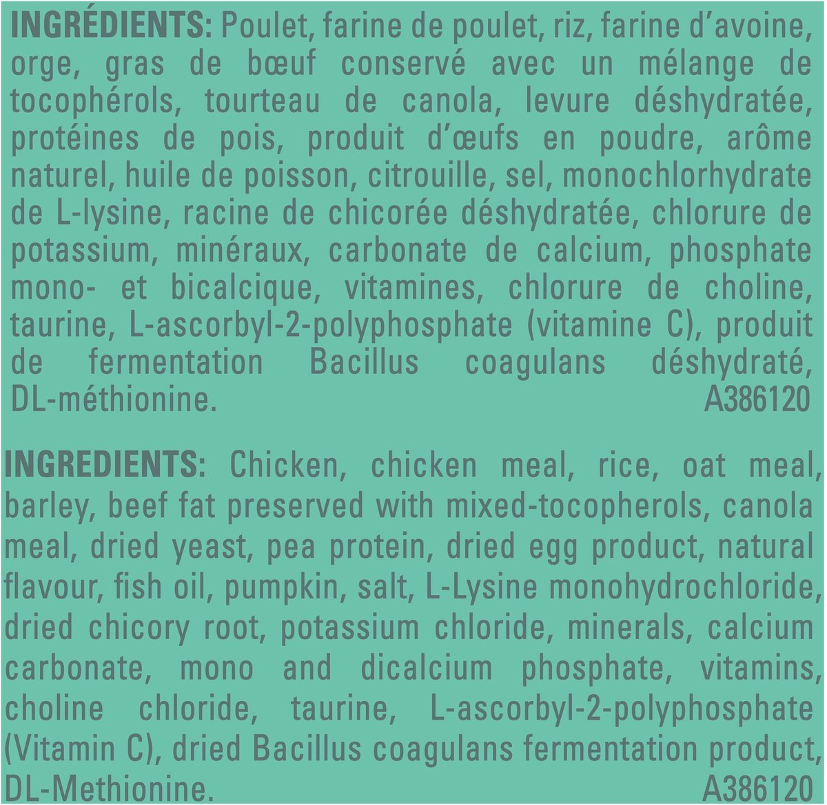 Chicken, Chicken Meal, Rice, Oat Meal, Barley, Beef Fat Preserved with Mixed-Tocopherols, Canola Meal, Dried Yeast, Pea Protein, Dried Egg Product, Natural Flavour, Fish Oil, Pumpkin, Salt, L-Lysine Monohydrochloride, Dried Chicory Root, Potassium Chloride, Minerals, Calcium Carbonate, Mono and Dicalcium Phosphate, Vitamins, Choline Chloride, Taurine, L-Ascorbyl-2-Polyphosphate (Vitamin C), Dried Bacillus Coagulans Fermentation Product, DL-Methionine. A386120.