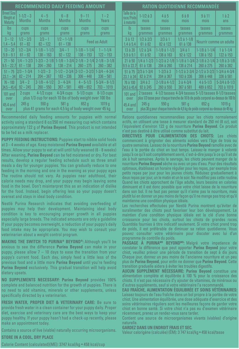 Although you'll be anxious to see the difference Purina Beyond can make in your puppy, please allow 7–10 days to ease the transition from your puppy's current food. Each day, simply feed a little less of the previous food and a little more Purina Beyond until you're feeding Purina Beyond exclusively. This gradual transition will help avoid dietary upsets.