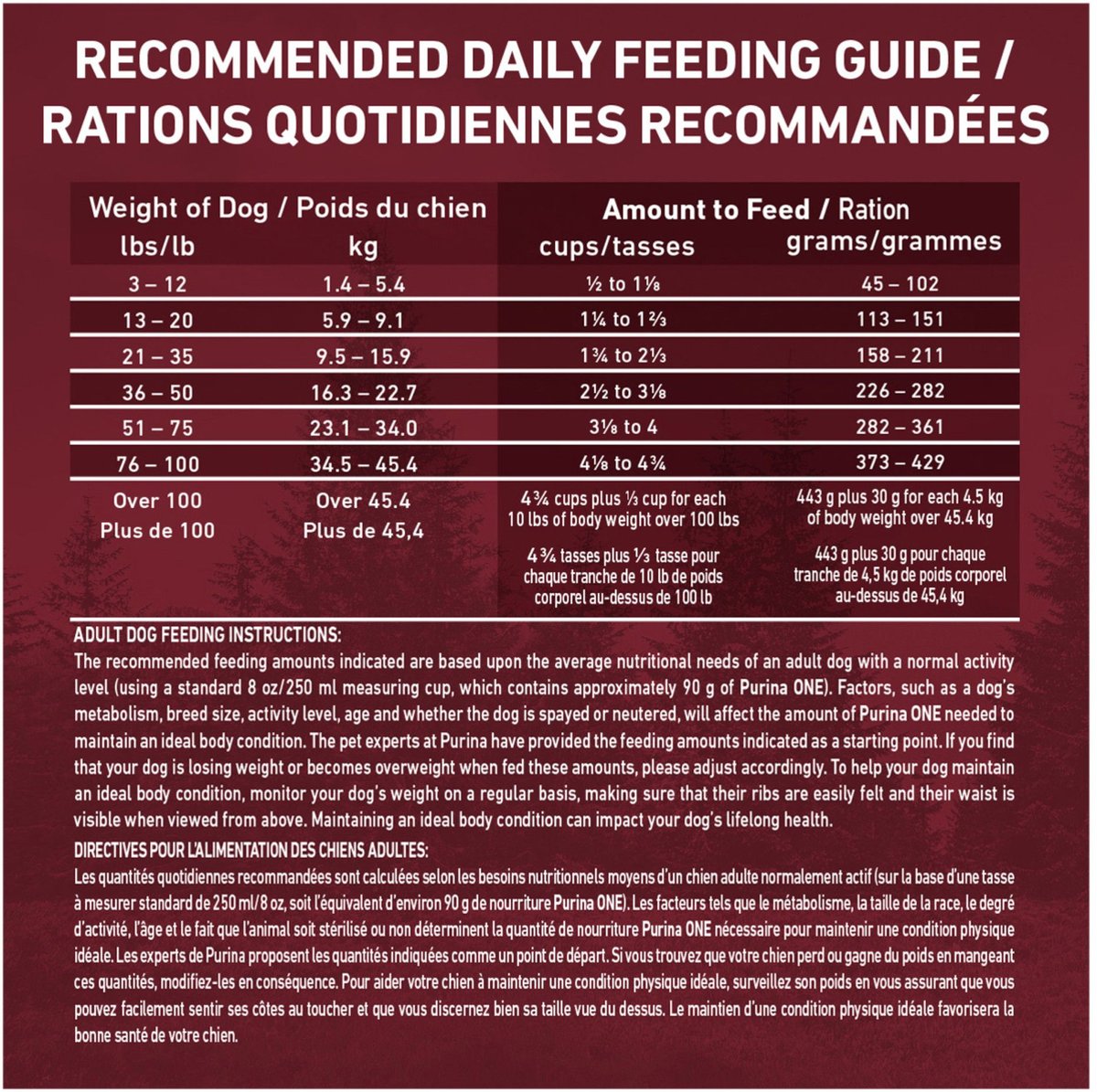 The recommended feeding amounts indicated are based upon the average nutritional needs of an adult dog with a normal, activity level (using a standard 8 oz. /250mL measuring cup. which contains approximately 90g of Purina ONE). Factors, such as a dog's metabolism, breed size, activity level, age and whether the dog is spayed or neutered, will affect the amount of Purina ONE needed to maintain an ideal body condition. The pet experts at Purina have provided the feeding amounts indicated as a starting point. If you find that your dog is losing weight or becomes overweight when fed these amounts, please adjust accordingly. To help your dog maintain an ideal body condition, monitor your dog's weight on a regular basis, making sure that his ribs are easily felt and the waist is visible when viewed from above. Maintaining an ideal body condition can impact your dog's lifelong health.
