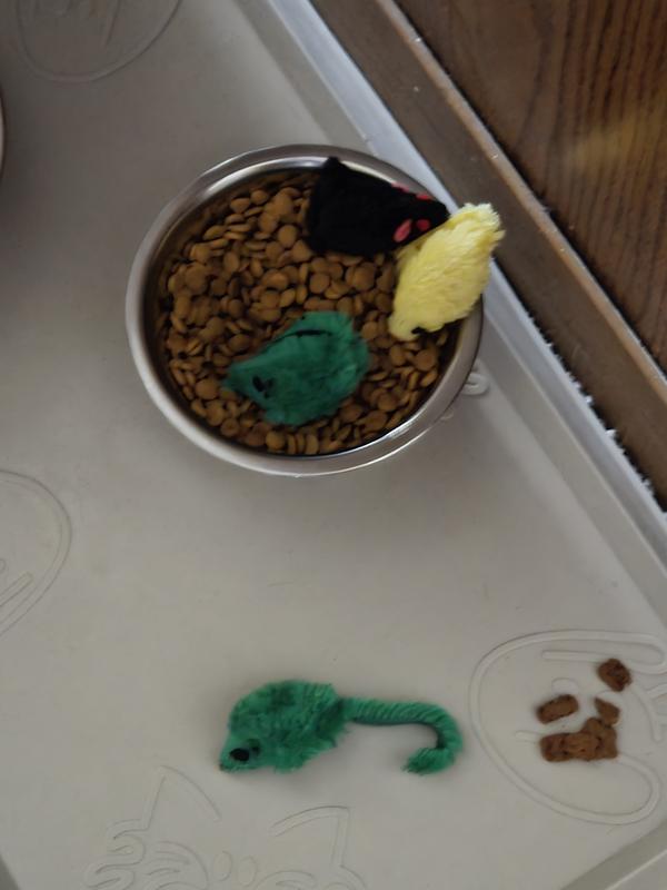 Poppy loves simple chicken formulas. The food does well with her tummy issues, and she adorns her food dish with a mouse toy. She loves a nice crunch to her dry food.