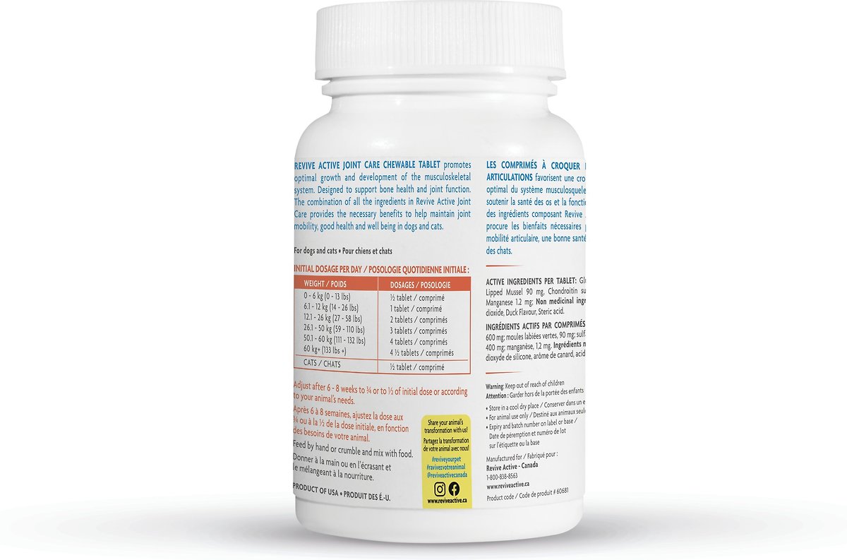 Per tablet: Glucosamine HCL 600 mg, Green Lipped Mussel 90 mg, Chondroitin Sulphate 80 mg, MSM 400 mg, Manganese 1.2 mg. Non Medicinal Ingredients: Brewer's Yeast, Silicon Dioxide, Duck Flavour, Stearic Acid.