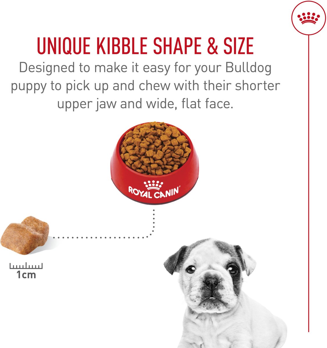 • Specialized kibble helps Bulldogs easily pick up and chew their food.