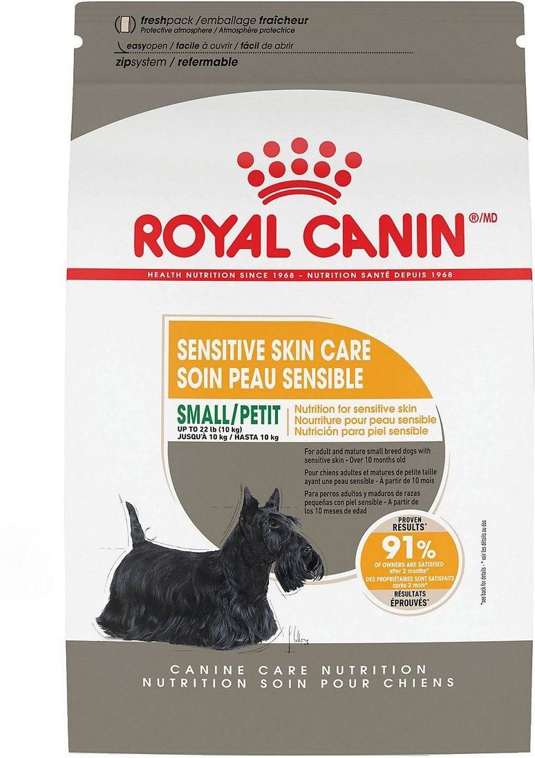 This dry dog food is formulated for small dogs 10 months and older weighing up to 22 pounds with sensitive skin and dry coats. We recommend the Royal Canin Medium Sensitive Skin Care Adult Medium Breed Dry Dog Food medium breed dogs weighing between 21 and 55 pounds, who are 12 months of age or older and have sensitive skin issues.