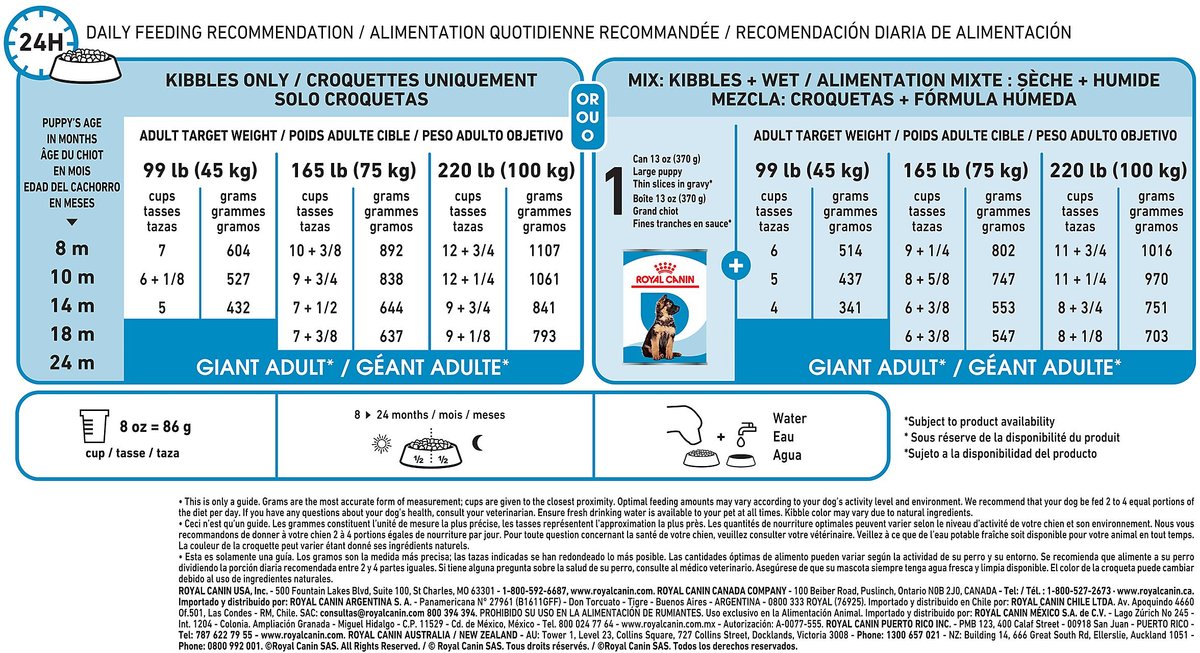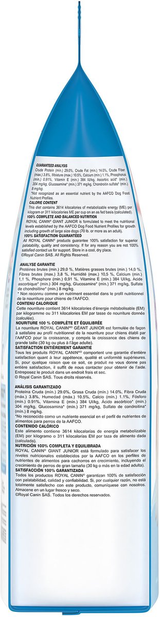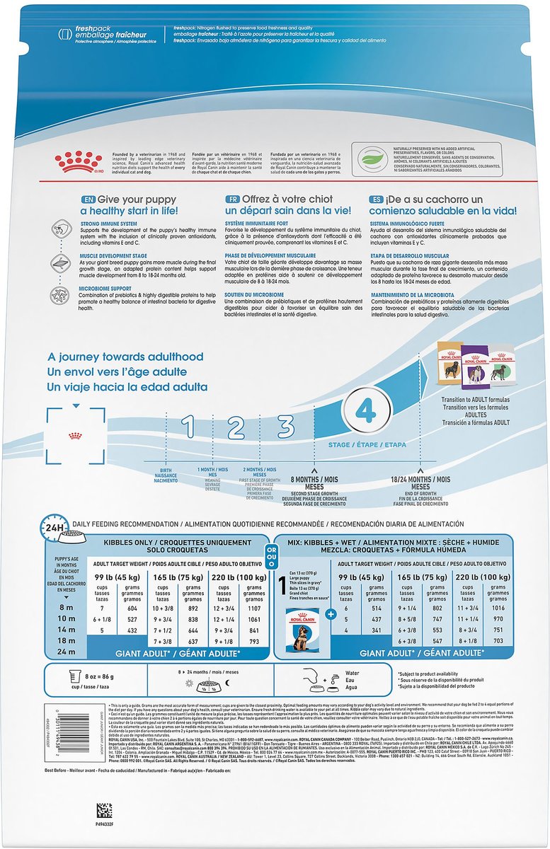 Your giant puppy has unique nutritional needs during the period of intense growth from 2 to 8 months. Royal Canin Giant Puppy supports these needs with clinically proven antioxidants and a combination of prebiotics and highly digestible proteins. It also helps your puppy avoid excess weight gain.