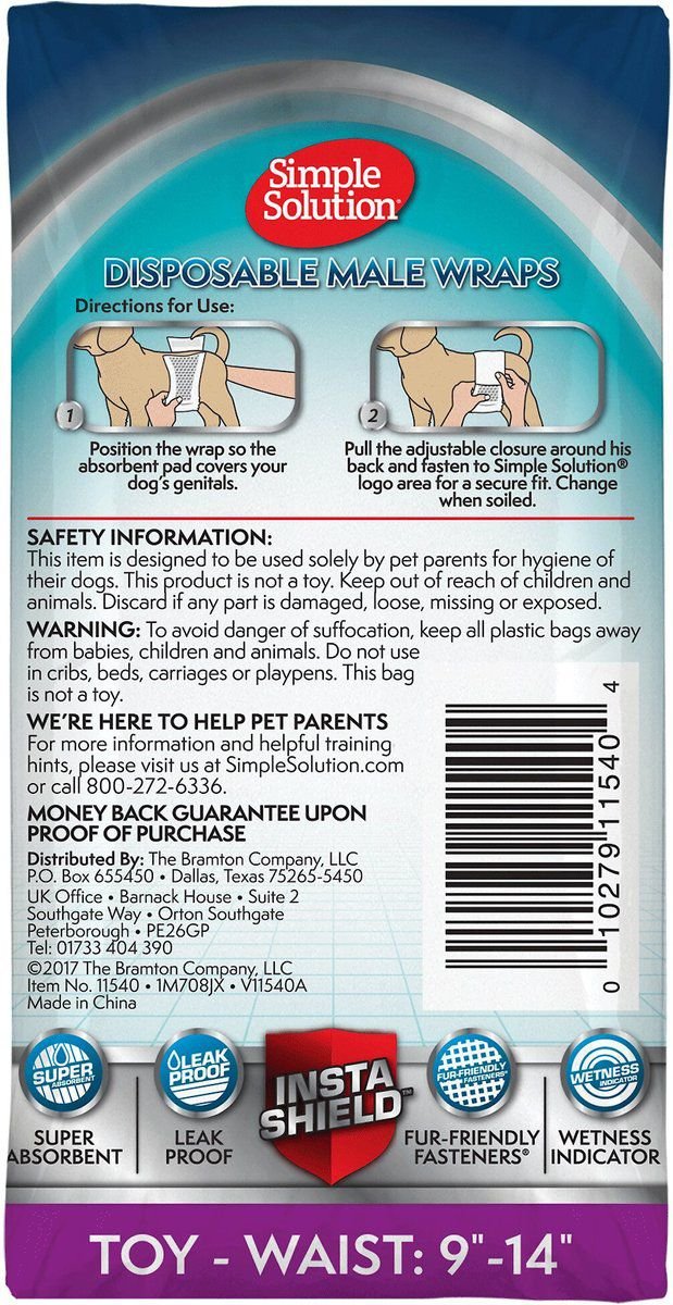 - Pull the adjustable closure around his back and fasten to Simple Solution logo area for a secure fit. Change when soiled.