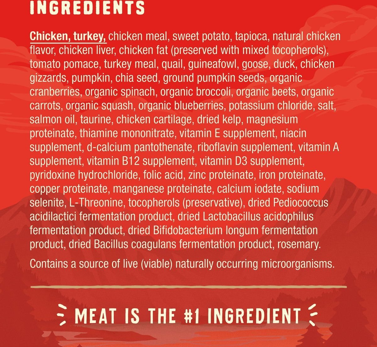 Chicken, Turkey, Chicken Meal, Sweet Potato, Tapioca, Natural Chicken Flavor, Chicken Liver, Chicken Fat (Preserved With Mixed Tocopherols), Tomato Pomace, Turkey Meal, Quail, Guineafowl, Goose, Duck, Chicken Gizzards, Pumpkin, Chia Seed, Ground Pumpkin Seeds, Organic Cranberries, Organic Spinach, Organic Broccoli, Organic Beets, Organic Carrots, Organic Squash, Organic Blueberries, Potassium Chloride, Salt, Salmon Oil, Taurine, Chicken Cartilage, Dried Kelp, Magnesium Proteinate, Thiamine Mononitrate, Vitamin E Supplement, Niacin Supplement, D-Calcium Pantothenate, Riboflavin Supplement, Vitamin A Supplement, Vitamin B12 Supplement, Vitamin D3 Supplement, Pyridoxine Hydrochloride, Folic Acid, Zinc Proteinate, Iron Proteinate, Copper Proteinate, Manganese Proteinate, Calcium Iodate, Sodium Selenite, L-Threonine, Tocopherols (Preservative), Dried Pediococcus Acidilactici Fermentation Product, Dried Lactobacillus Acidophilus Fermentation Product, Dried Bifidobacterium Longum Fermentation Product, Dried Bacillus Coagulans Fermentation Product, Rosemary. Contains A Source Of Live (Viable) Naturally Occurring Microorganisms.