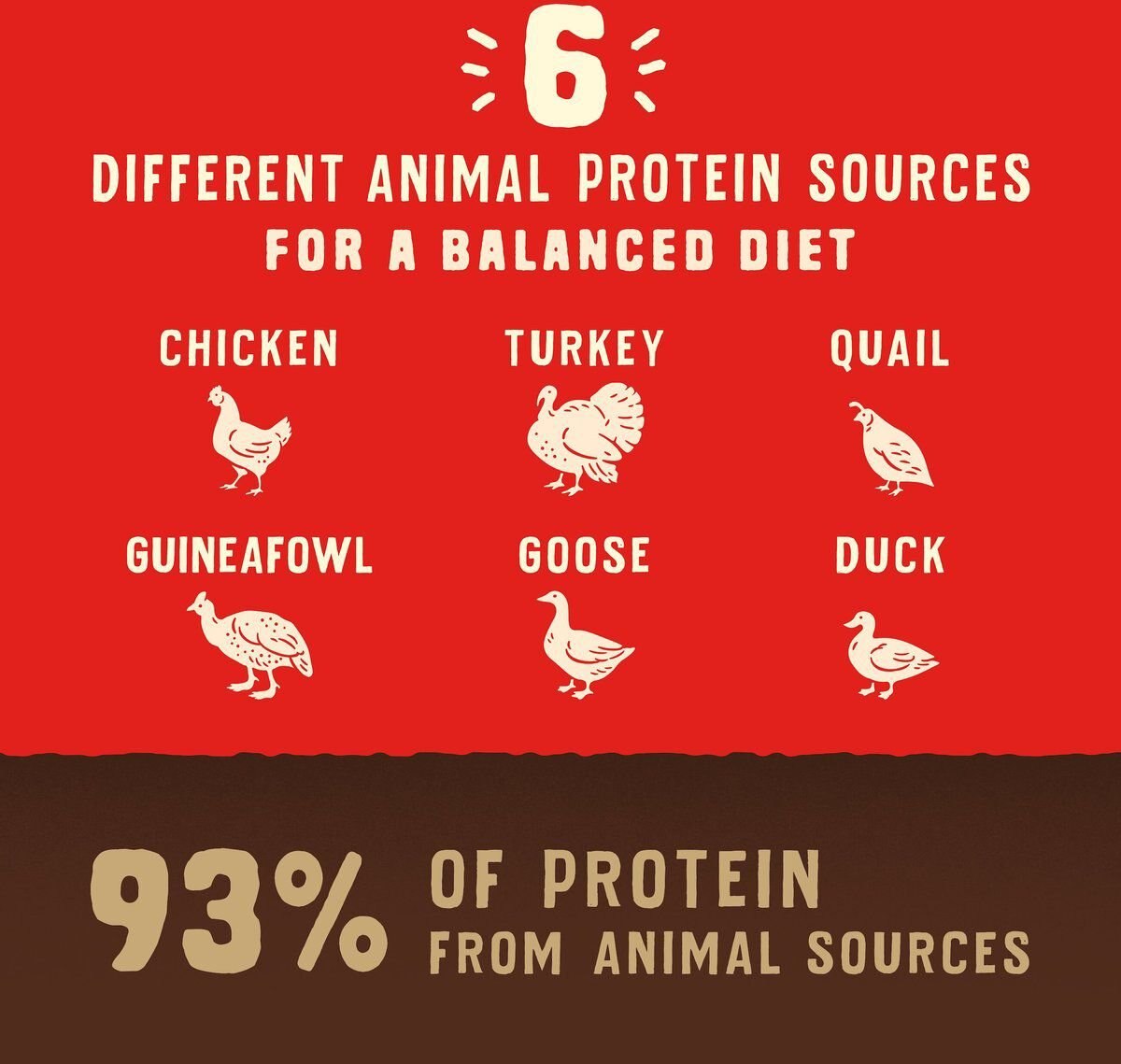 - Packed full of protein with chicken, turkey, quail, guineafowl, goose, and duck.