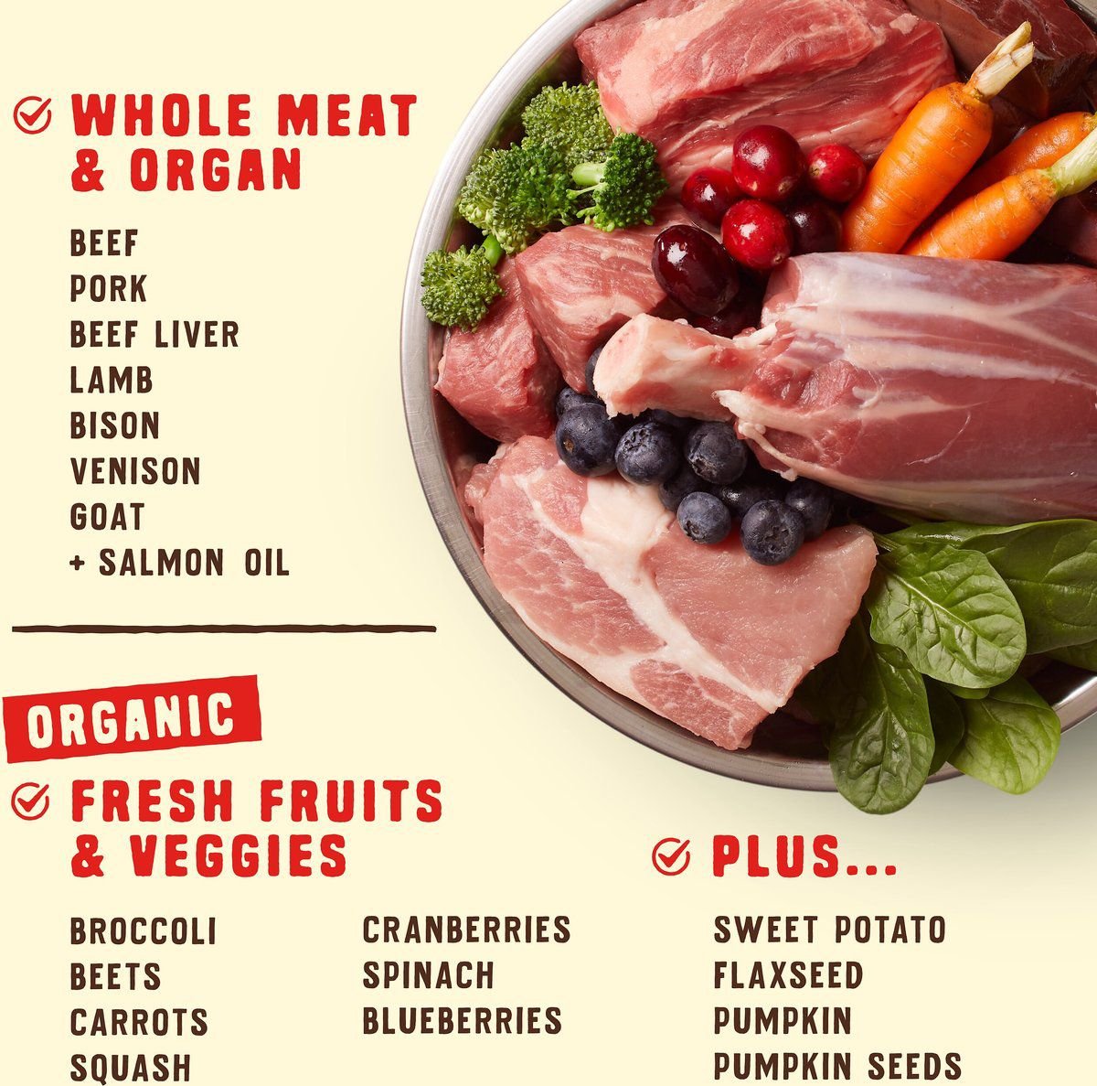 Beef, Pork, Pork Meal, Sweet Potato, Tapioca, Beef Liver, Natural Pork Flavor, Pork Fat (Preserved With Mixed Tocopherols), Lamb Meal, Ground Flaxseed, Tomato Pomace, Lamb, Bison, Venison, Goat, Beef Kidney, Beef Tripe, Pumpkin, Organic Broccoli, Organic Beets, Organic Carrots, Organic Squash, Organic Cranberries, Organic Spinach, Organic Blueberries, Ground Pumpkin Seeds, Chia Seed, Beef Bone, Potassium Chloride, Salt, Choline Chloride, Salmon Oil, Taurine, Beef Cartilage, Dried Kelp, Thiamine Mononitrate, Vitamin E Supplement, Niacin Supplement, D-Calcium Pantothenate, Riboflavin Supplement, Vitamin A Supplement, Vitamin B12 Supplement, Vitamin D3 Supplement, Pyridoxine Hydrochloride, Folic Acid, L-Threonine, Zinc Proteinate, Iron Proteinate, Copper Proteinate, Manganese Proteinate, Calcium Iodate, Sodium Selenite, Tocopherols (Preservative), Magnesium Proteinate, Dried Pediococcus Acidilactici Fermentation Product, Dried Lactobacillus Acidophilus Fermentation Product, Dried Bifidobacterium Longum Fermentation Product, Dried Bacillus Coagulans Fermentation Product, Rosemary. Contains A Source Of Live (Viable) Naturally Occurring Microorganisms.