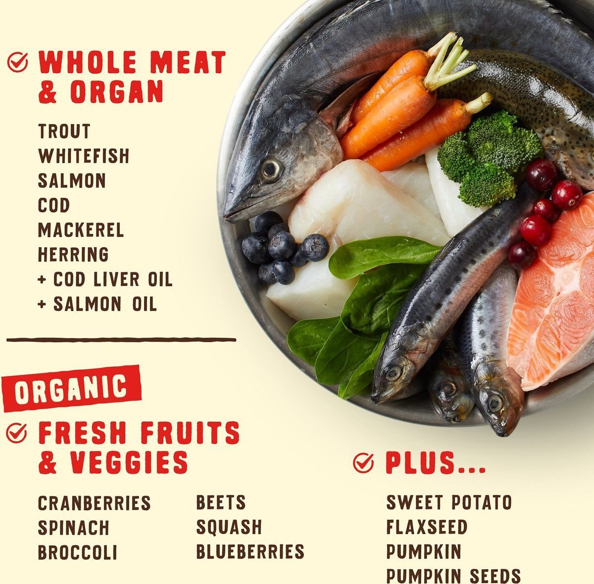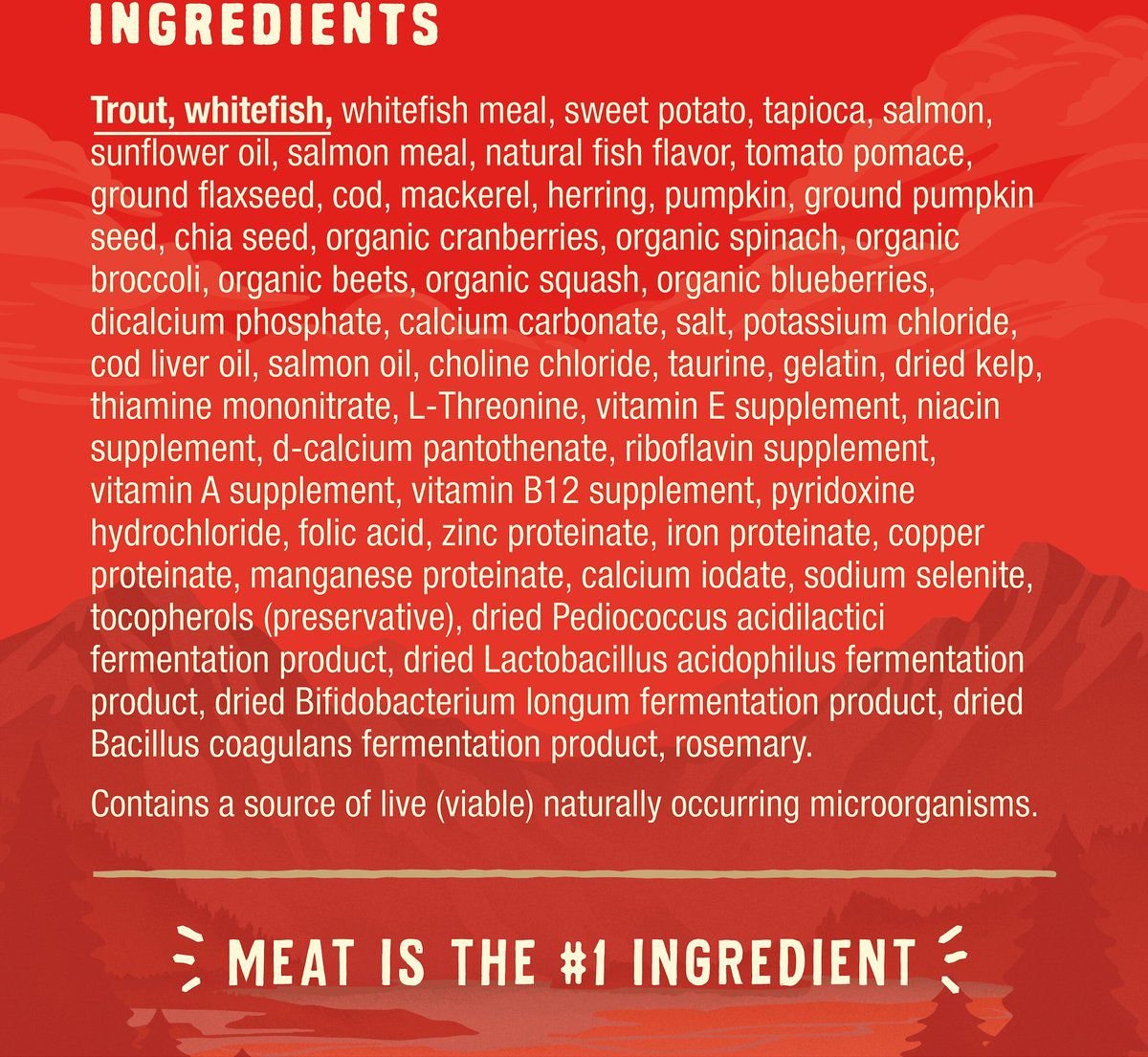 Trout, Whitefish, Whitefish Meal, Sweet Potato, Tapioca, Salmon, Sunflower Oil, Salmon Meal, Natural Fish Flavor, Tomato Pomace, Ground Flaxseed, Cod, Mackerel, Herring, Pumpkin, Ground Pumpkin Seed, Chia Seed, Organic Cranberries, Organic Spinach, Organic Broccoli, Organic Beets, Organic Squash, Organic Blueberries, Dicalcium Phosphate, Calcium Carbonate, Salt, Potassium Chloride, Cod Liver Oil, Salmon Oil, Choline Chloride, Taurine, Gelatin, Dried Kelp, Thiamine Mononitrate, L-Threonine, Vitamin E Supplement, Niacin Supplement, D-Calcium Pantothenate, Riboflavin Supplement, Vitamin A Supplement, Vitamin B12 Supplement, Pyridoxine Hydrochloride, Folic Acid, Zinc Proteinate, Iron Proteinate, Copper Proteinate, Manganese Proteinate, Calcium Iodate, Sodium Selenite, Tocopherols (Preservative), Dried Pediococcus Acidilactici Fermentation Product, Dried Lactobacillus Acidophilus Fermentation Product, Dried Bifidobacterium Longum Fermentation Product, Dried Bacillus Coagulans Fermentation Product, Rosemary. Contains A Source Of Live (Viable) Naturally Occurring Microorganisms.