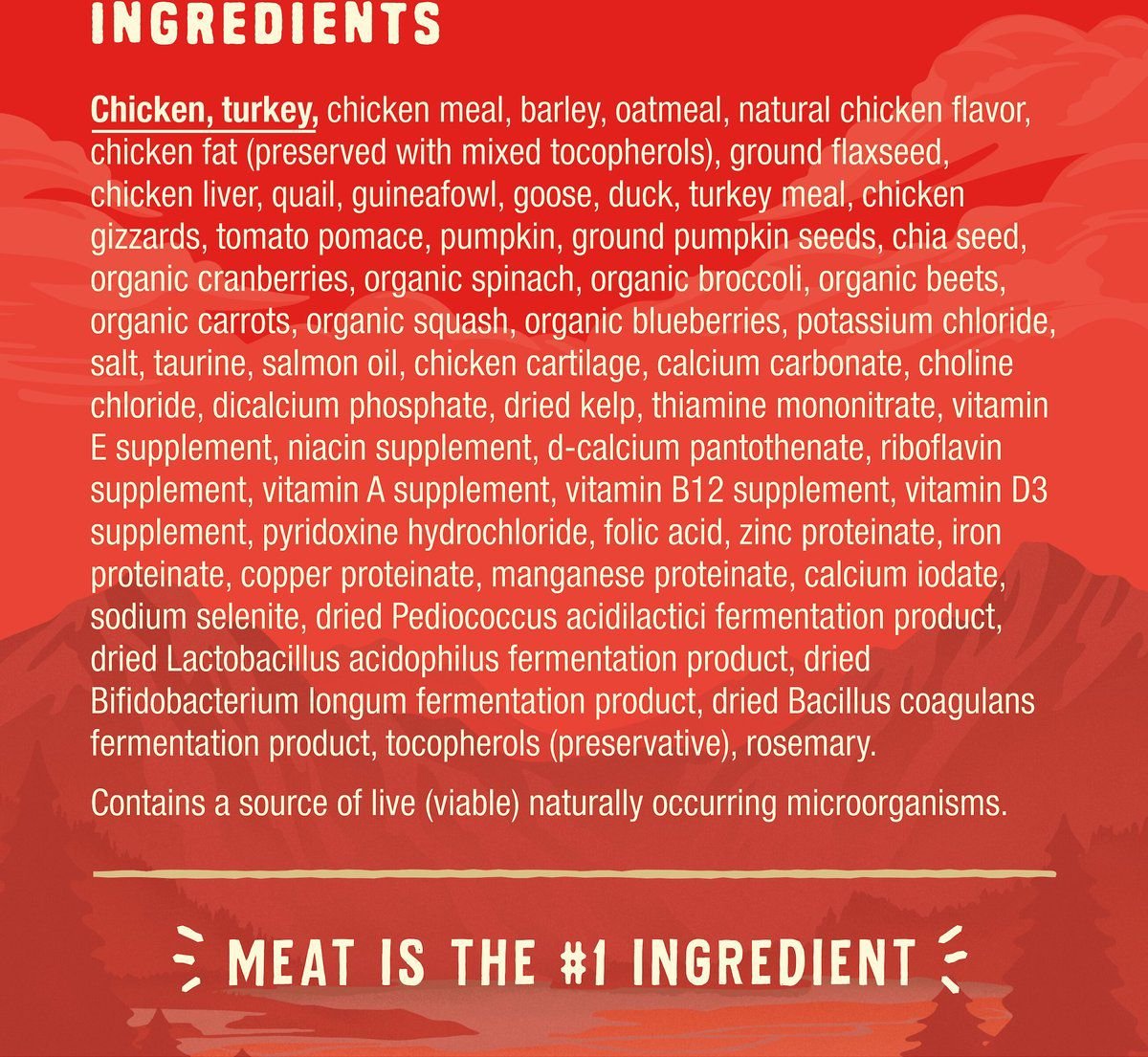 Chicken, Turkey, Chicken Meal, Barley, Oatmeal, Natural Chicken Flavor, Chicken Fat (Preserved With Mixed Tocopherols), Ground Flaxseed, Chicken Liver, Quail, Guineafowl, Goose, Duck, Turkey Meal, Chicken Gizzards, Tomato Pomace, Pumpkin, Ground Pumpkin Seeds, Chia Seed, Organic Cranberries, Organic Spinach, Organic Broccoli, Organic Beets, Organic Carrots, Organic Squash, Organic Blueberries, Potassium Chloride, Salt, Taurine, Salmon Oil, Chicken Cartilage, Calcium Carbonate, Choline Chloride, Dicalcium Phosphate, Dried Kelp, Thiamine Mononitrate, Vitamin E Supplement, Niacin Supplement, D-Calcium Pantothenate, Riboflavin Supplement, Vitamin A Supplement, Vitamin B12 Supplement, Vitamin D3 Supplement, Pyridoxine Hydrochloride, Folic Acid, Zinc Proteinate, Iron Proteinate, Copper Proteinate, Manganese Proteinate, Calcium Iodate, Sodium Selenite, Dried Pediococcus Acidilactici Fermentation Product, Dried Lactobacillus Acidophilus Fermentation Product, Dried Bifidobacterium Longum Fermentation Product, Dried Bacillus Coagulans Fermentation Product, Tocopherols (Preservative), Rosemary. Contains A Source Of Live (Viable) Naturally Occurring Microorganisms.