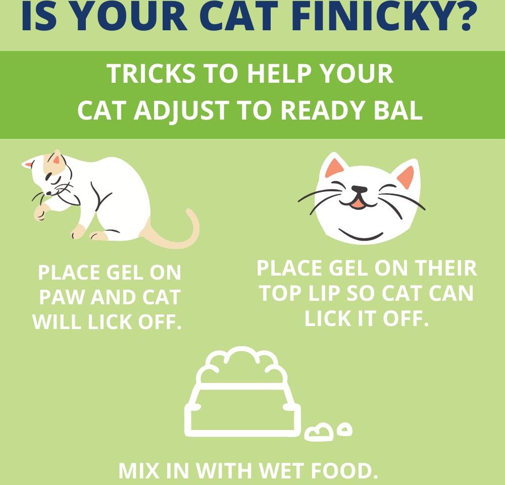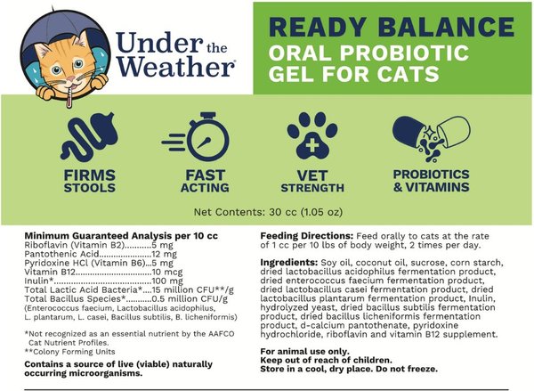 My cat would throw-up every couple of days no matter what food she would eat. Also, the worst diarrhea every day. Started using Ready Balance, from day one, problems solved. I love the syringe with the easy way it dispenses the gel. I give her 1cc a day in her food. Thanks to Chewy for carrying Under the Weather products. I am a happy Auto-ship customer.