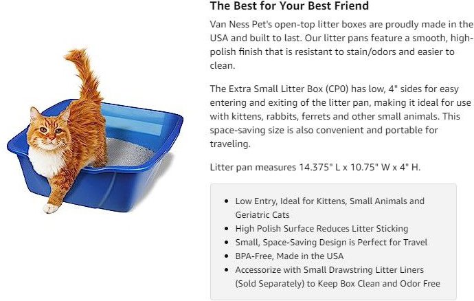 This litter box is BPA free and USFDA food contact approved for humans and animals. All Van Ness plastic is manufactured in the USA. The recycling # is 5 on all of our plastic items.